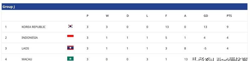 J组的韩国队同样表现强势,三场比赛保持全胜。在最后一轮1-0小胜印尼的比赛中,黄度允开场6分钟就为球队锁定胜局。虽然韩国队全场狂轰20脚射门,但印尼门将的神勇表现避免了更大比分的失利。最终韩国队以9分领跑小组,印尼4分惊险晋级。