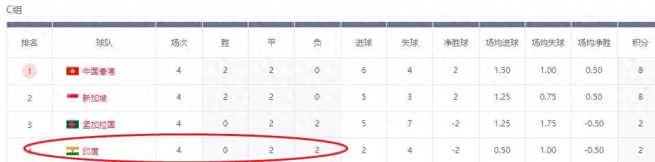 北京时间10月14日,亚洲杯预选赛第4轮全面开打。C组的两场比赛里,中国香港1-1战平孟加拉国,印度则以0-2不敌新加坡。比赛结束后,C组的中国香港和新加坡都积8分,暂时排在前两名;印度在前4轮只取得2分,排名垫底,提前出局。