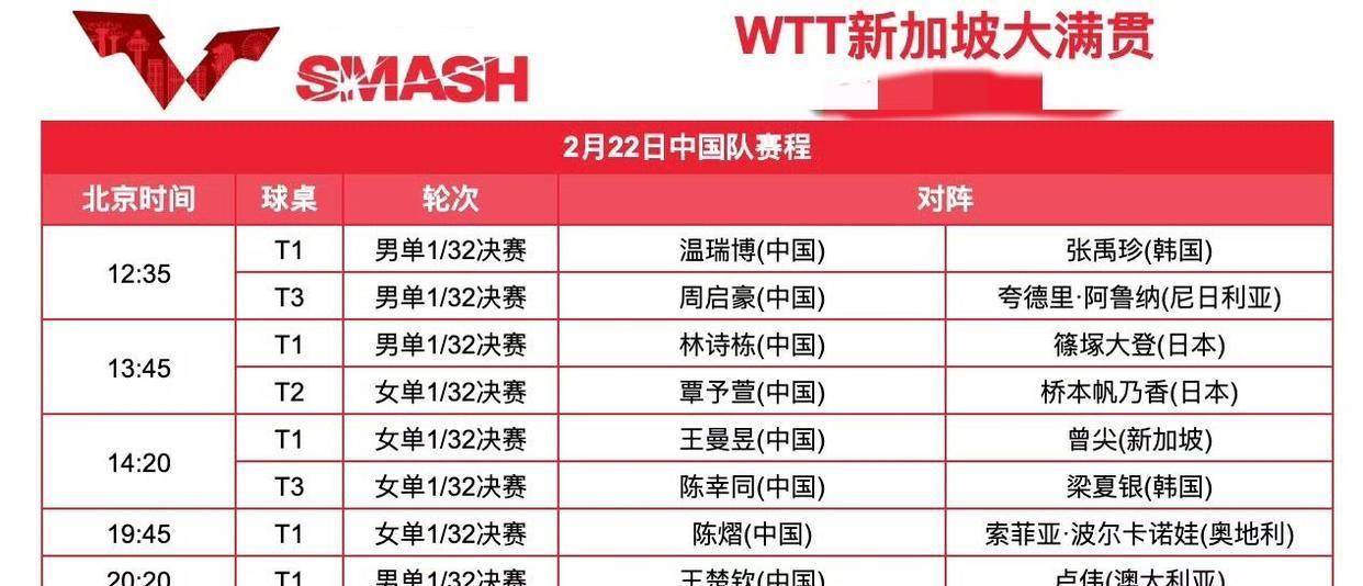 2026-02-22足球直播,欧洲杯直播,体育直播,球客直播,雷速体育,篮球直播,风驰直播,NBA直播,英超直播,足球比分,足球赛事,意甲,欧冠,世界杯,世界杯直播,村超,贵州村超,波胆,角球,串球,大小球各位球迷朋友注意了,今天想看电视直播为国乒加油的,频道可千万别调错了! 2026年WTT新加坡大满贯正赛首日,也就是2月22日中午12点就要正式开打了,王楚钦、王曼昱领衔的国乒8名选手将轮番登场。但央视的直播安排出了个不大不小的变化,平时大家习惯看的CCTV5体育频道,今天全天都不会转播任何一场乒乓球比赛。