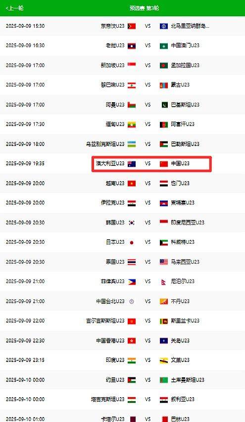 2025-09-12足球直播,欧洲杯直播,体育直播,球客直播,雷速体育,篮球直播,风驰直播,NBA直播,英超直播,足球比分,足球赛事,意甲,欧冠,世界杯,世界杯直播,村超,贵州村超,波胆,角球,串球,大小球9月9日晚上7点35分,U23国足要踢U23亚洲杯预选赛的最后一场,对手是澳大利亚队。