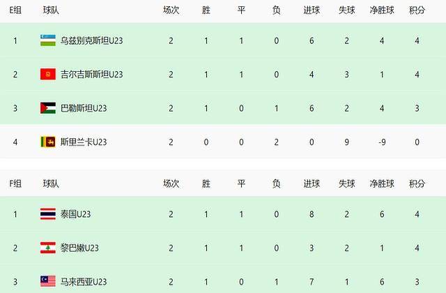E组的乌兹别克斯坦和吉尔吉斯斯坦现在都是4分,F组的泰国和黎巴嫩也是4分。