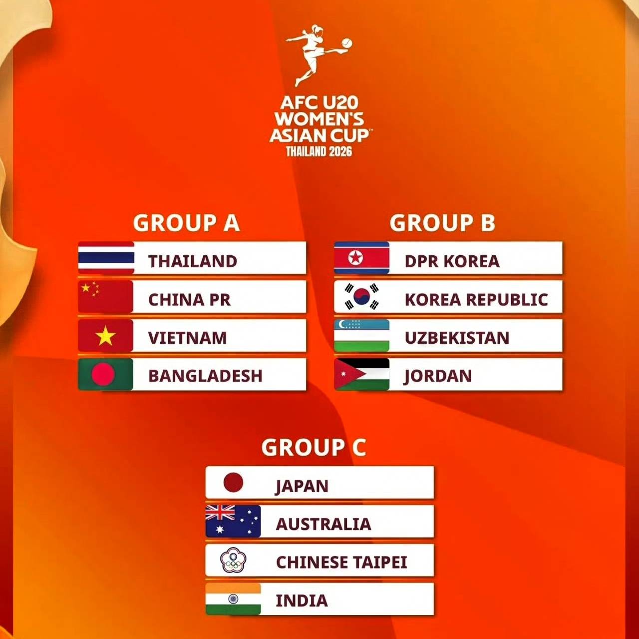 本届U20女足亚洲杯,中国U20女足与东道主泰国队、越南队、孟加拉国队分在了A组,小组赛阶段每组前2名,和成绩最好的两个小组第3名,都能够晋级到本次比赛的淘汰赛阶段(8强战)。