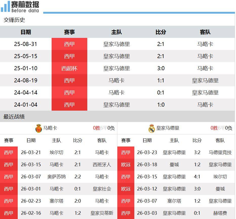 第二:争冠vs保级,皇马分心欧冠,马洛卡主场死磕盼拿分!皇马要争冠,马洛卡要保级,皇马伤病问题经过国际比赛日的缓冲有所减轻,但主力门将库尔图瓦依然缺席,因为皇马后防线并不稳固。下周中就是欧冠1/4决赛,皇马主场迎战拜仁,因此此役肯定会有所分心。西甲剩余比赛对于马洛卡而言场场都是保级大战,主场需要死磕皇马渴望拿分。两队实力虽然皇马远胜于马洛卡,但皇马分心欧冠主场迎战拜仁以及库尔图瓦的伤缺和队长巴尔韦德停赛,此役皇马存在丢分的可能性,因为皇马客战保级球队并不稳。