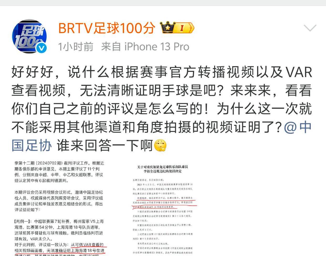 北京广播电视台的《BRTV足球100分》栏目官方微博发帖,质疑中国足协的评议有问题。他们在这条社交动态里写道:“好,那你们说根据比赛官方转播视频和VAR回放,确实看不清是不是手球对吧?那来来来,看看你们之前是怎么评的!为什么这次就不能用其他角度、其他渠道拍到的视频来证明了?还@了中国足协,直接质问:到底谁来给个说法啊?”