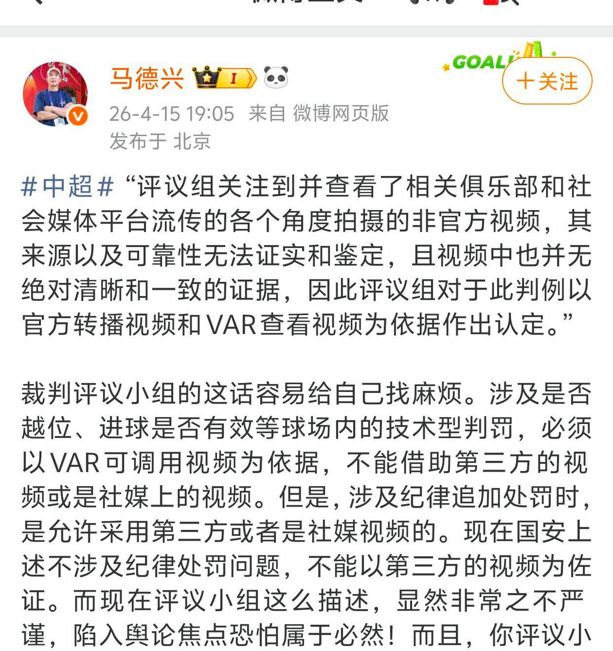 另外,足球媒体人马德兴也说了:“裁判评议小组这么说,其实是在给自己找麻烦。像越位、进球是否有效这些技术性判罚,必须得用VAR能调出来的视频作为依据,不能随便拿第三方或者社交媒体上的视频来当证据。但如果是涉及纪律处罚的追加,那用第三方或者社媒视频是可以的。现在国安这个情况,并不涉及纪律处罚,所以就不能拿第三方视频来做依据。评议小组这么一说,明显不够严谨,被舆论盯上是迟早的事!而且他们之前也用过第三方视频来追加处罚,怎么这次就忘了呢?真是不长记性!”