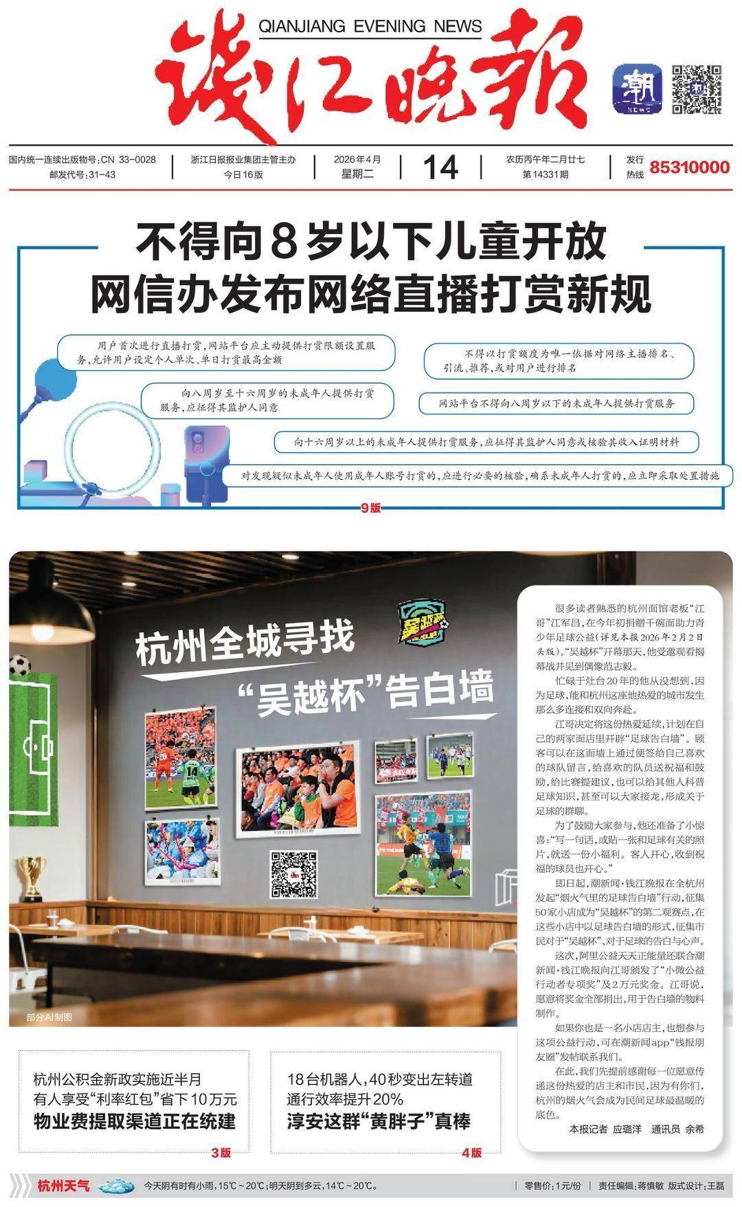 2026-04-22足球直播,欧洲杯直播,体育直播,球客直播,雷速体育,篮球直播,风驰直播,NBA直播,英超直播,足球比分,足球赛事,意甲,欧冠,世界杯,世界杯直播,村超,贵州村超,波胆,角球,串球,大小球各位好,还是你们的老朋友老蒋,欢迎来到这一期的钱江晚报视频读报栏目《钱报谈个版》。