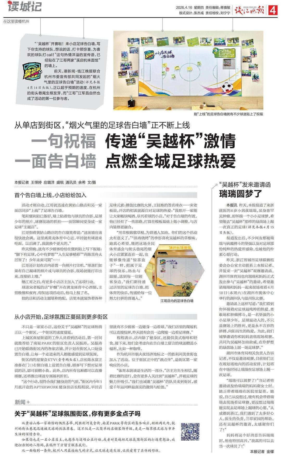 比如我们熟悉的一位老球迷,杭州面馆老板“”江军昌。今年初,他捐赠千碗面助力青少年足球公益,“吴越杯”开幕那天,他受邀观看揭幕战并见到偶像范志毅。为了把这份对足球的热爱传递下去,他第一个参与潮新闻·钱江晚报联合杭州市委宣传部共同发起的“烟火气里的足球告白墙”活动,为了鼓励大家参与,他还准备了小惊喜:“写一句话,或贴一张和足球有关的照片,就送一份小福利。客人开心,收到祝福的球员也开心。”