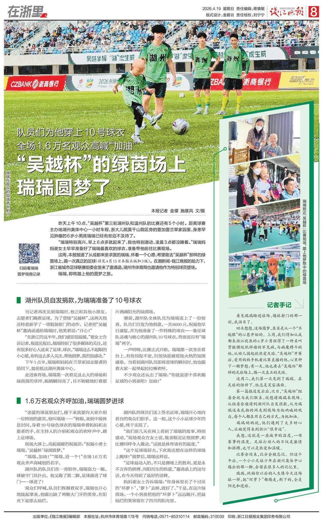 在潮新闻和钱江晚报的助力下,浙江省城市足球联赛组委会发来了“吴越杯”邀请函,湖州市体育局也邀请瑞瑞作为特别球员登场。