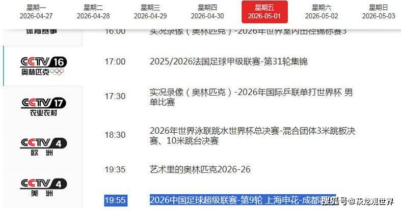 2026-04-28足球直播,欧洲杯直播,体育直播,球客直播,雷速体育,篮球直播,风驰直播,NBA直播,英超直播,足球比分,足球赛事,意甲,欧冠,世界杯,世界杯直播,村超,贵州村超,波胆,角球,串球,大小球中超联赛激战正酣!5月1日20:00,中超第9轮将迎来一场重头戏,上海申花坐镇主场迎战领头羊成都蓉城,央视奥林匹克频道CCTV16、五星体育、成都公共频道将现场直播本轮焦点对决!球迷也可通过央视体育客户端、央视频、咪咕视频APP、移动高清、咪视界等平台观赛。