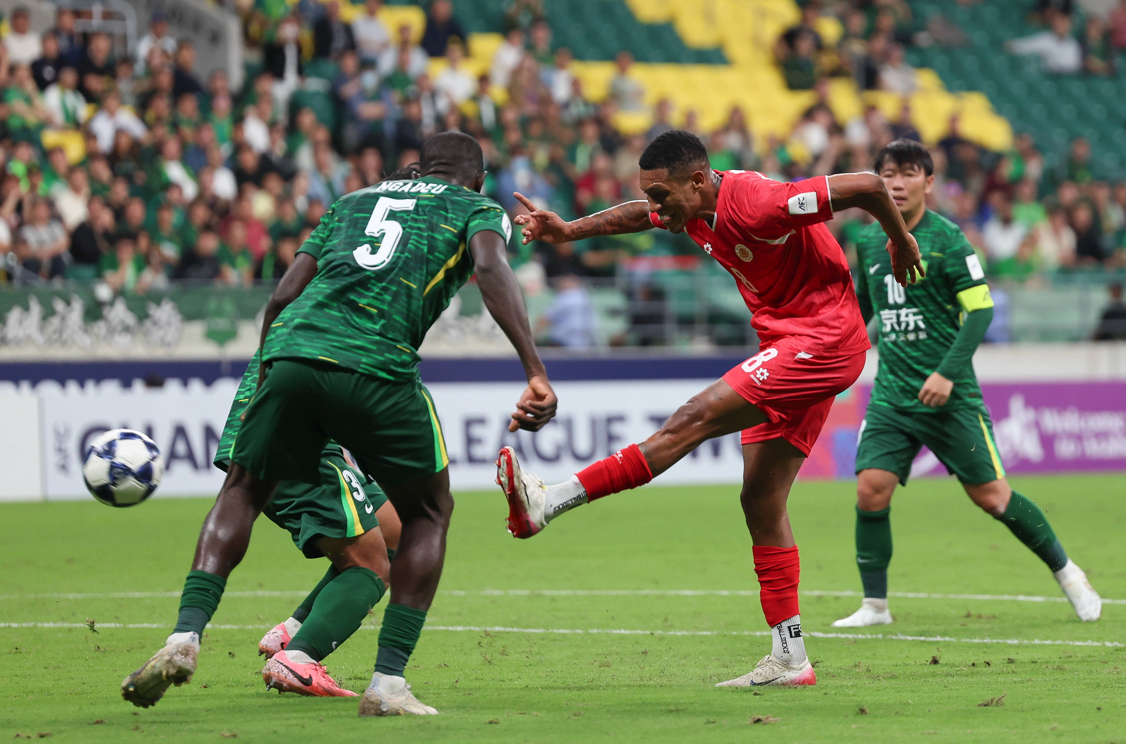 9月18日,北京国安队球员恩加德乌(前右)在比赛中。 新华社记者 胡星宇 摄