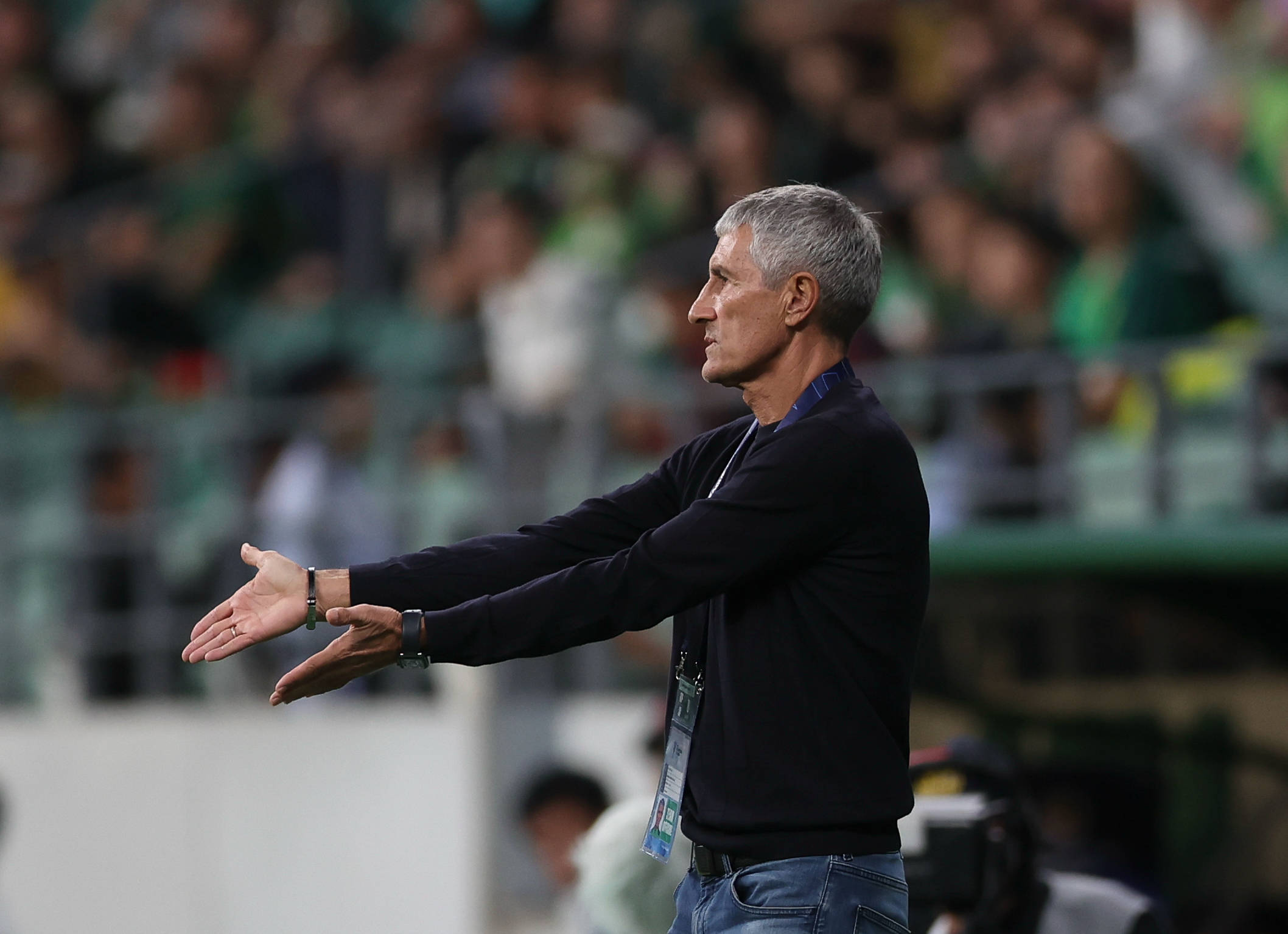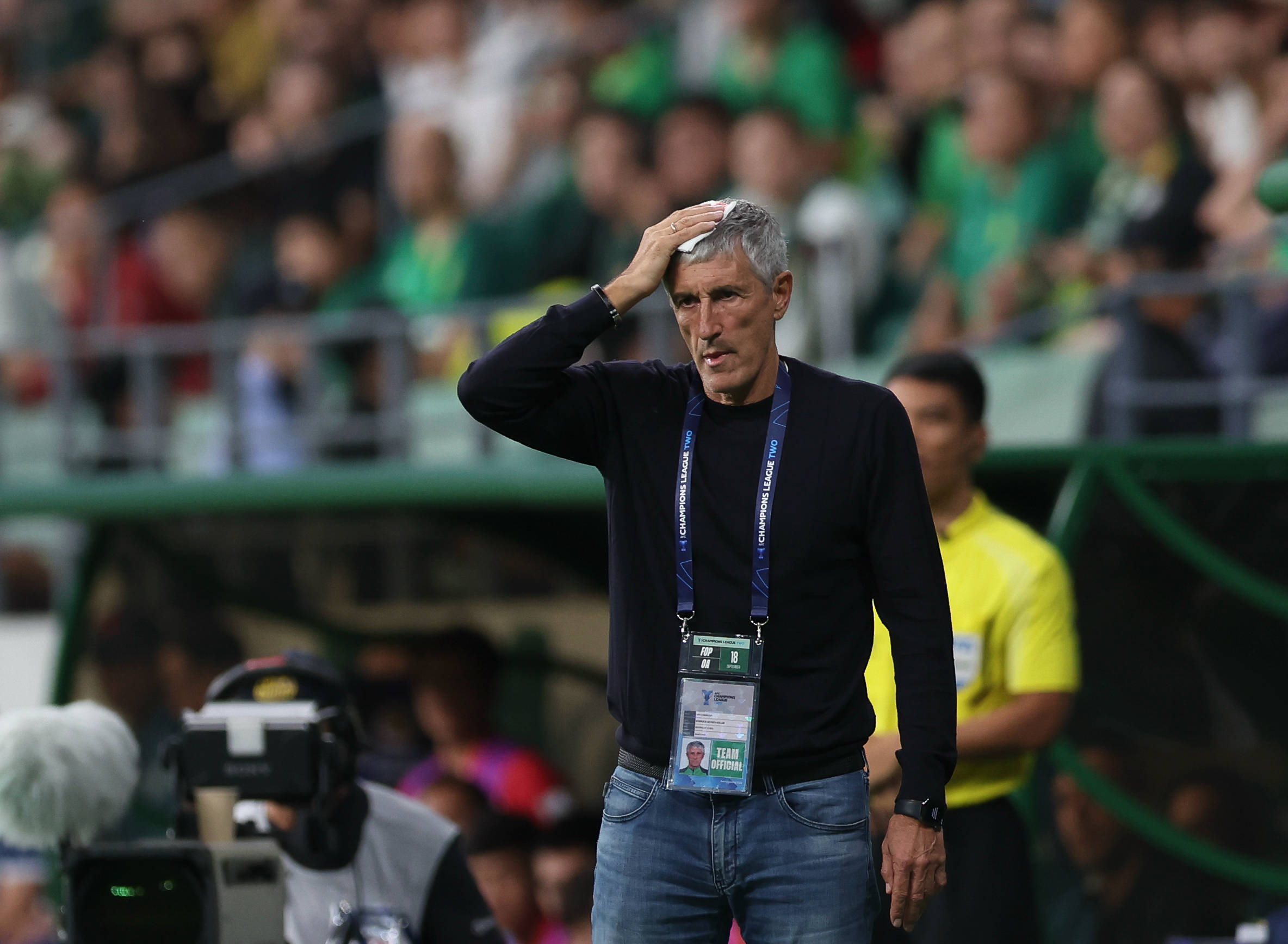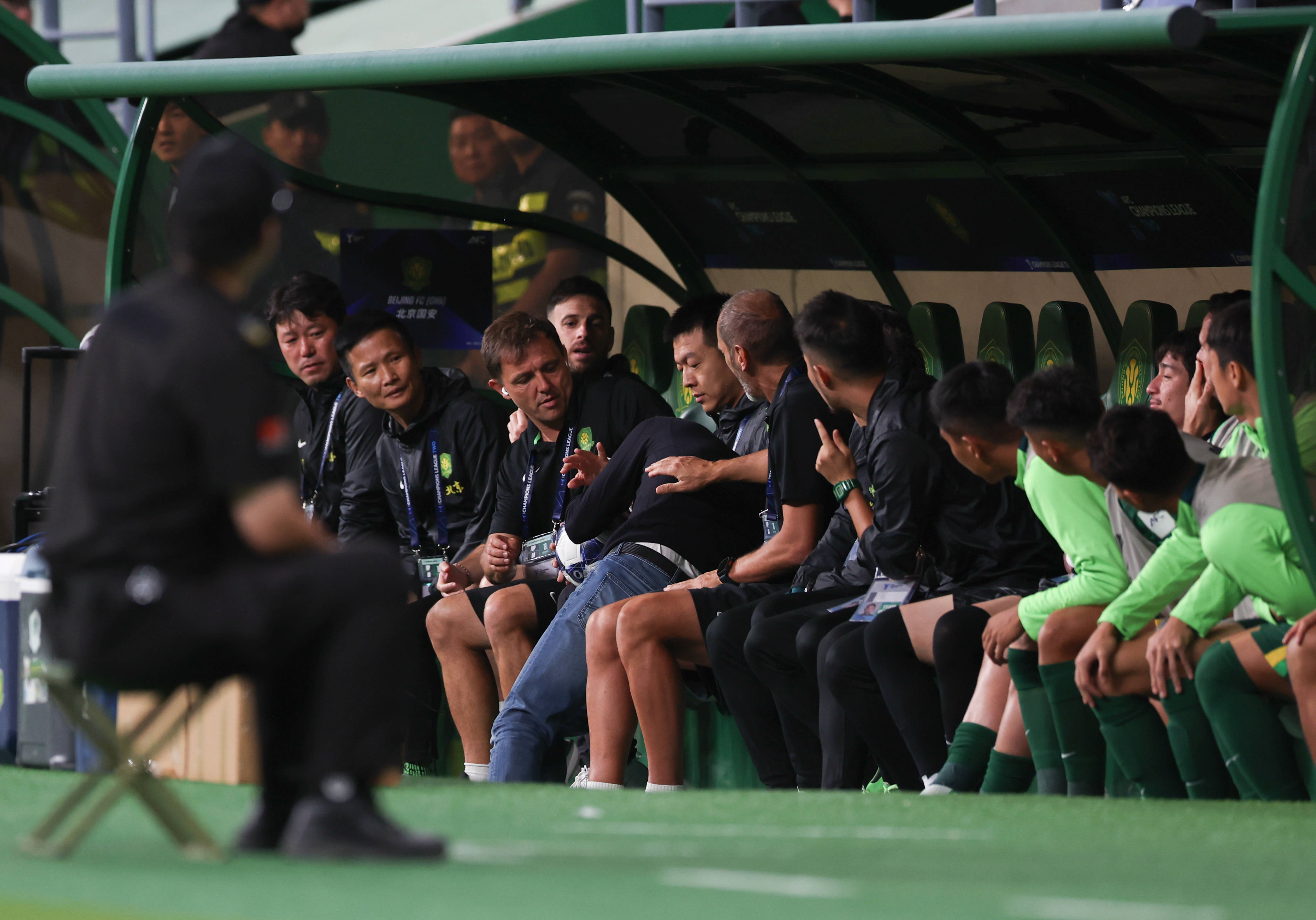 9月18日,北京国安队主教练塞蒂恩在场边被皮球砸中。 新华社记者 胡星宇 摄