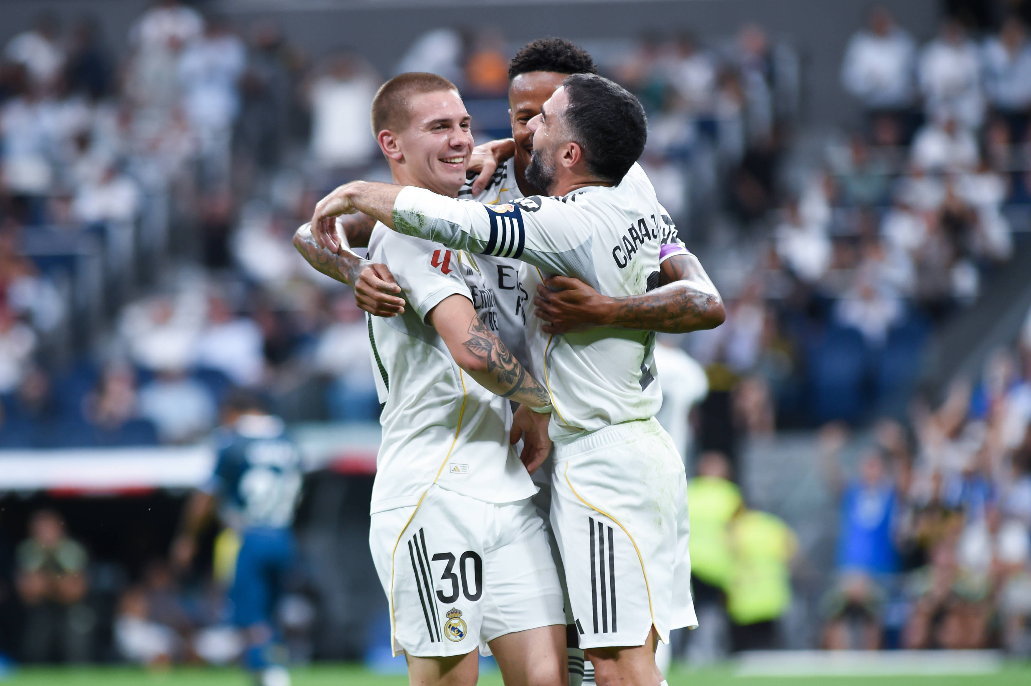 9月20日,皇家马德里队球员在比赛中庆祝进球。 新华社发(古斯塔沃·巴连特摄)