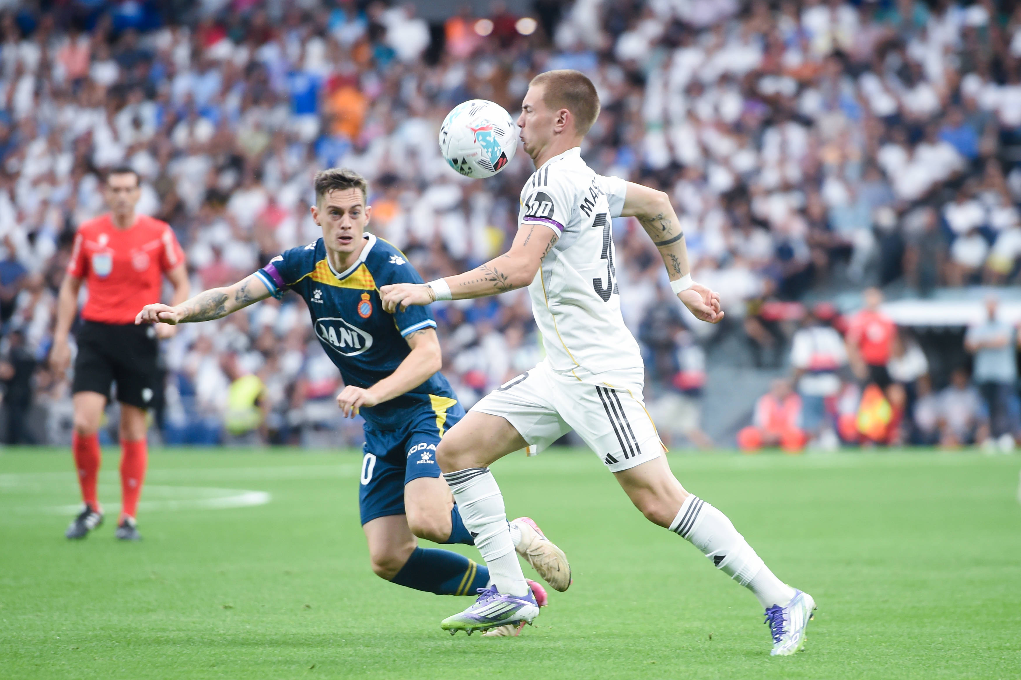 9月20日,皇家马德里队球员贡萨诺·加西亚(左)在比赛中防守西班牙人队球员卡布雷拉。 新华社发(古斯塔沃·巴连特摄)