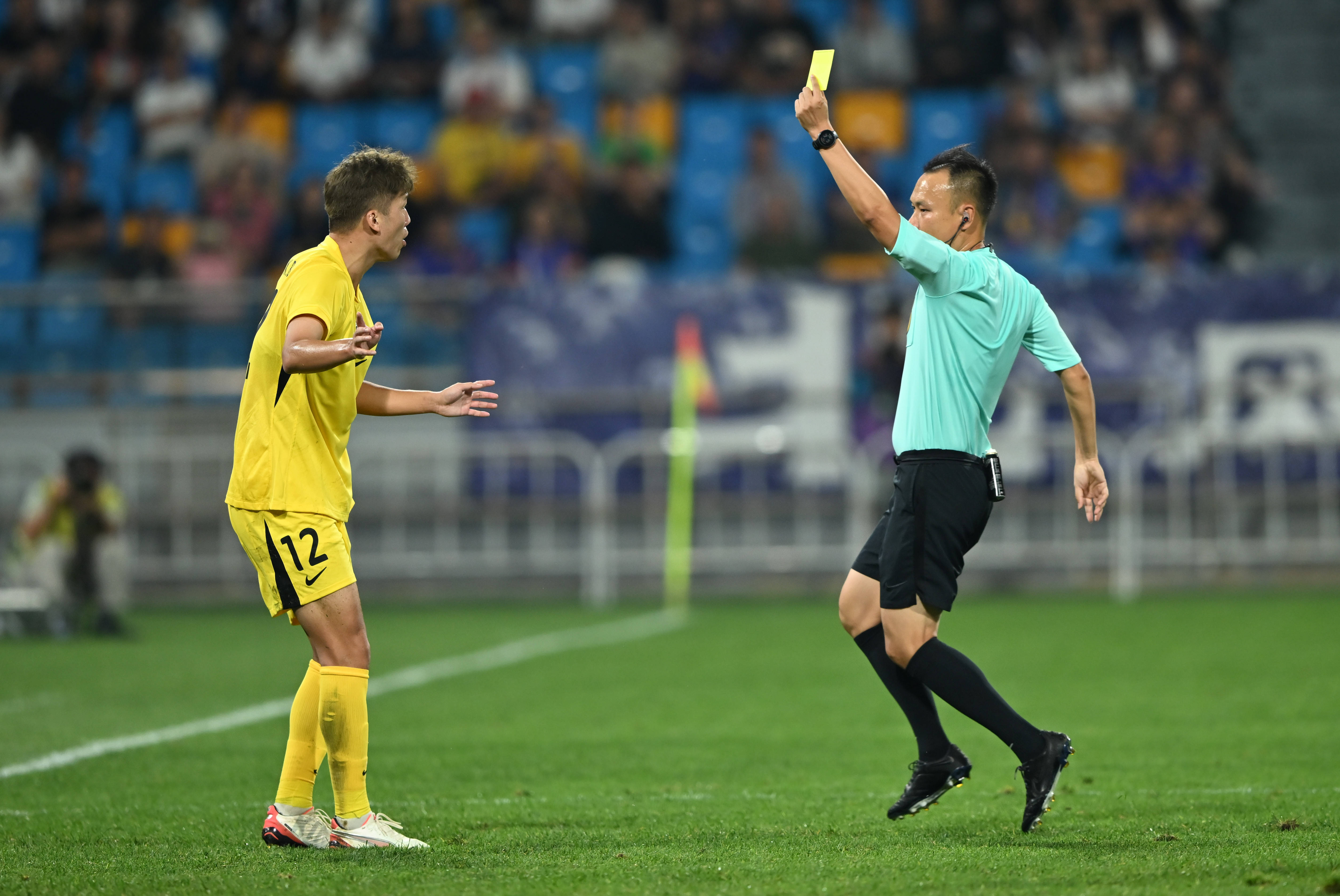 9月21日,主裁判王竞(右)向深圳新鹏城队球员张晓彬出示黄牌。 新华社记者 孙凡越 摄