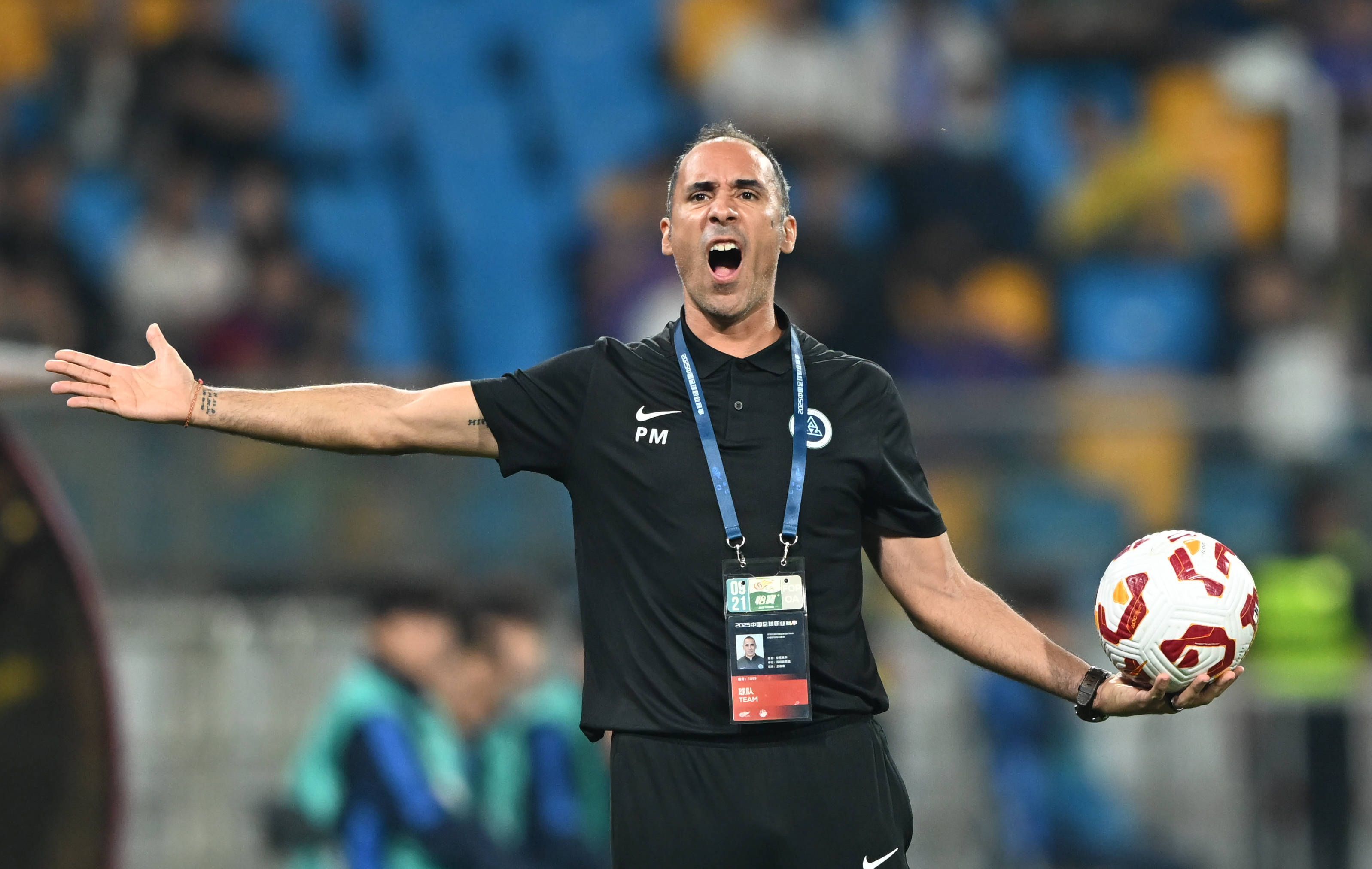 9月21日,深圳新鹏城队主教练穆尼奥斯在比赛中向边裁申请球队球权。 新华社记者 孙凡越 摄