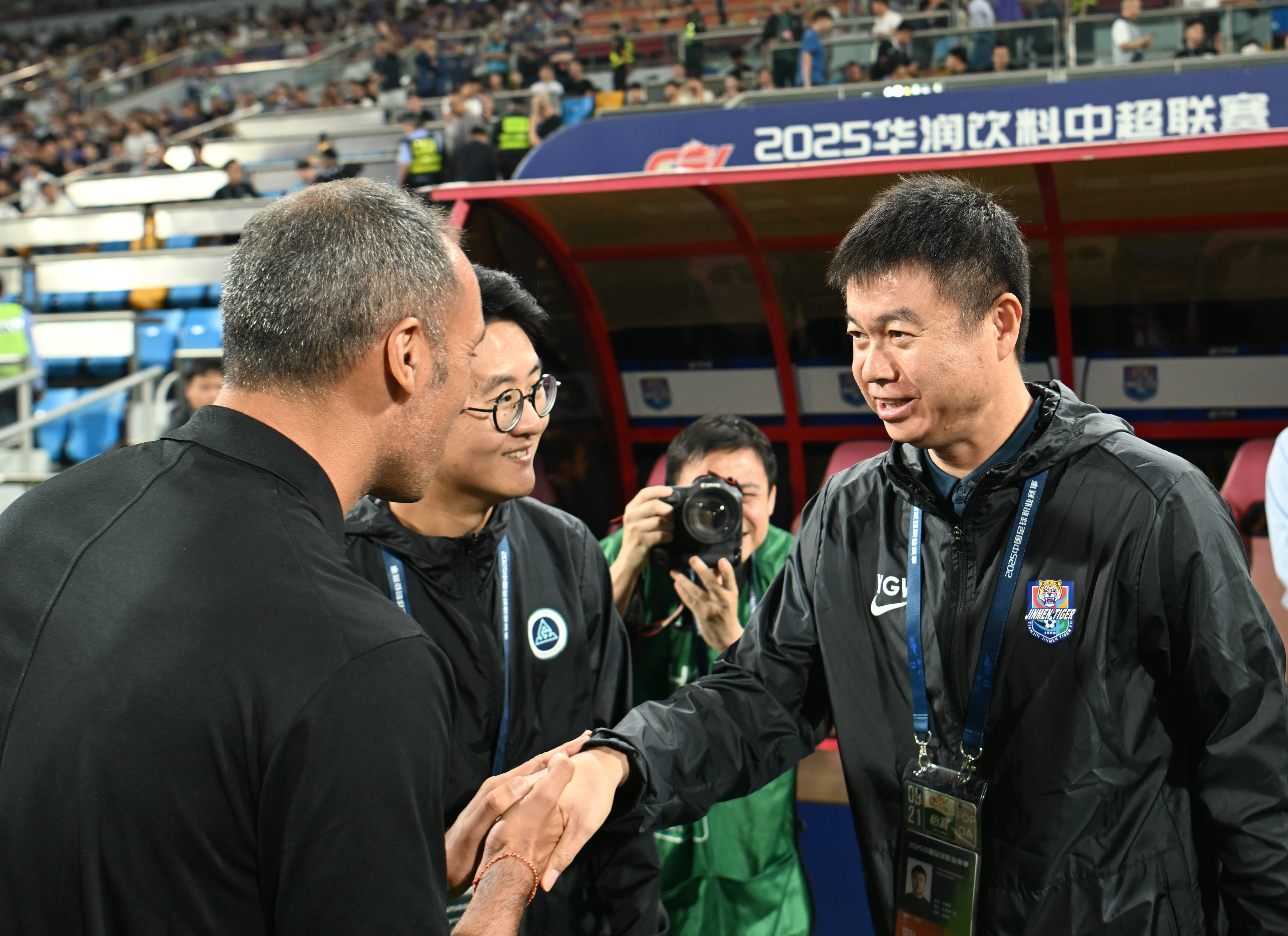 9月21日,天津津门虎队主教练于根伟(右)与深圳新鹏城队主教练穆尼奥斯(左)在赛前握手。 新华社记者 孙凡越 摄