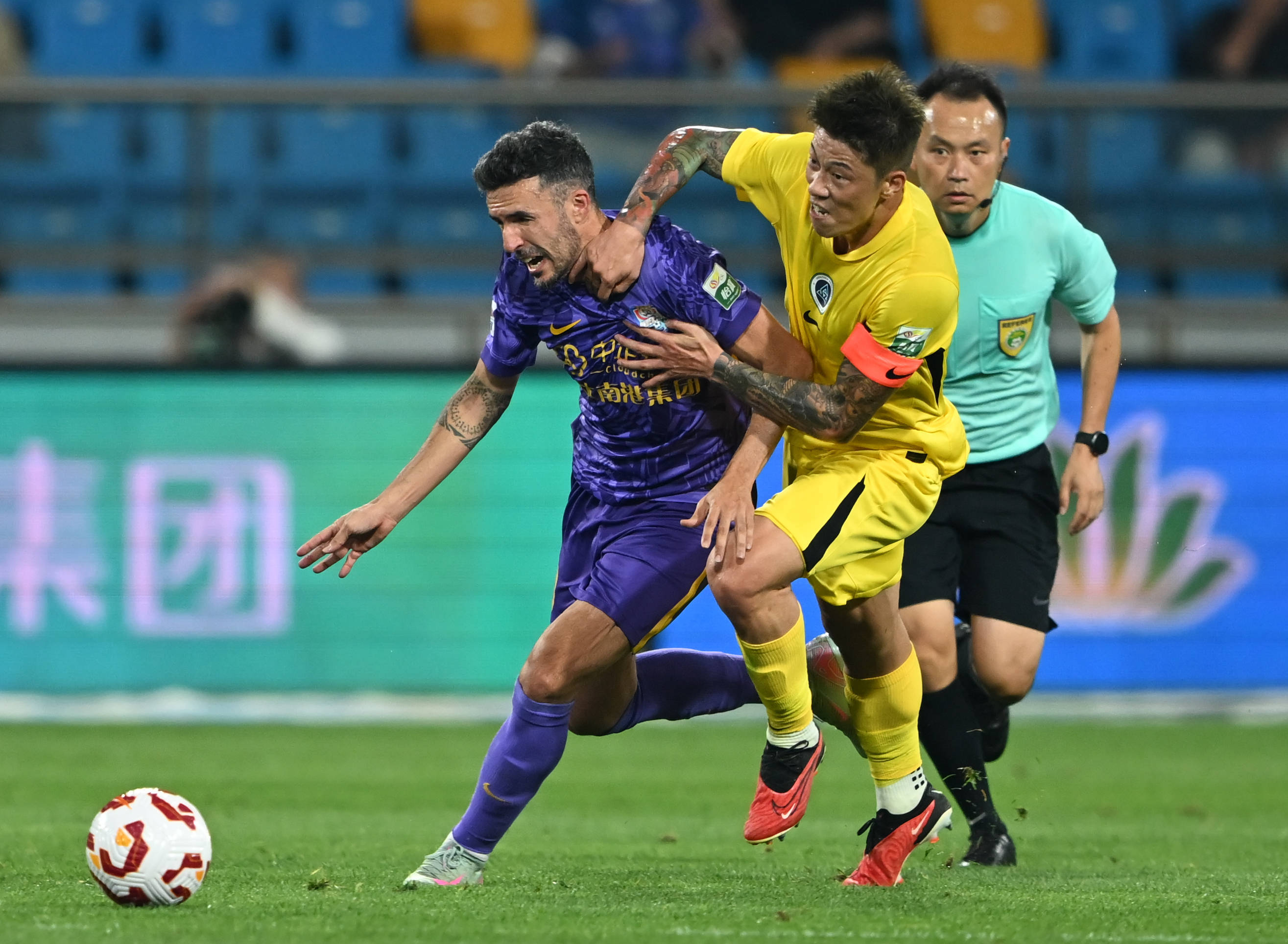 9月21日,天津津门虎队球员阿代米(左二)在比赛中射门。 新华社记者 孙凡越 摄