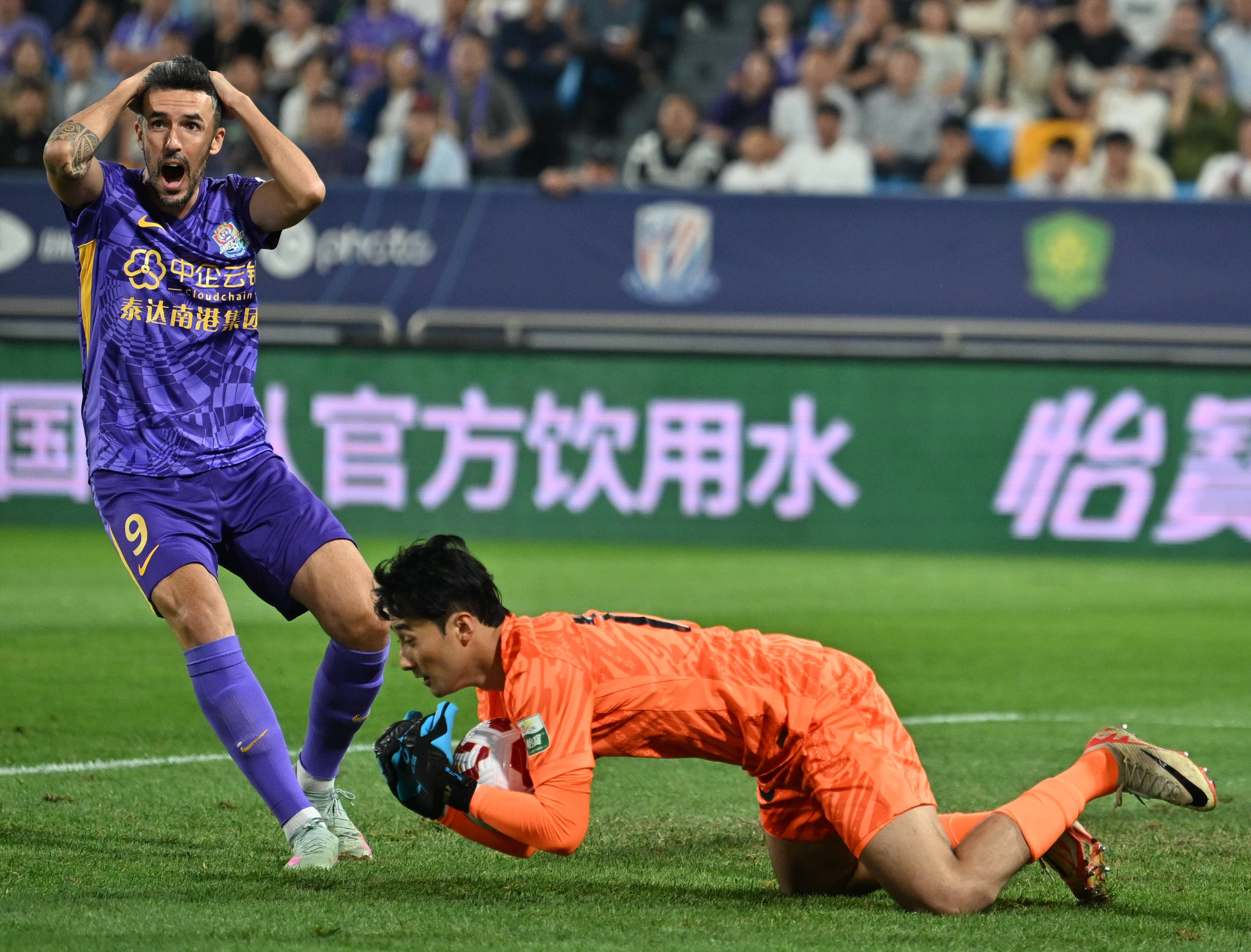 9月21日,天津津门虎队球员阿代米(左)在比赛中射门进球。 新华社记者 孙凡越 摄