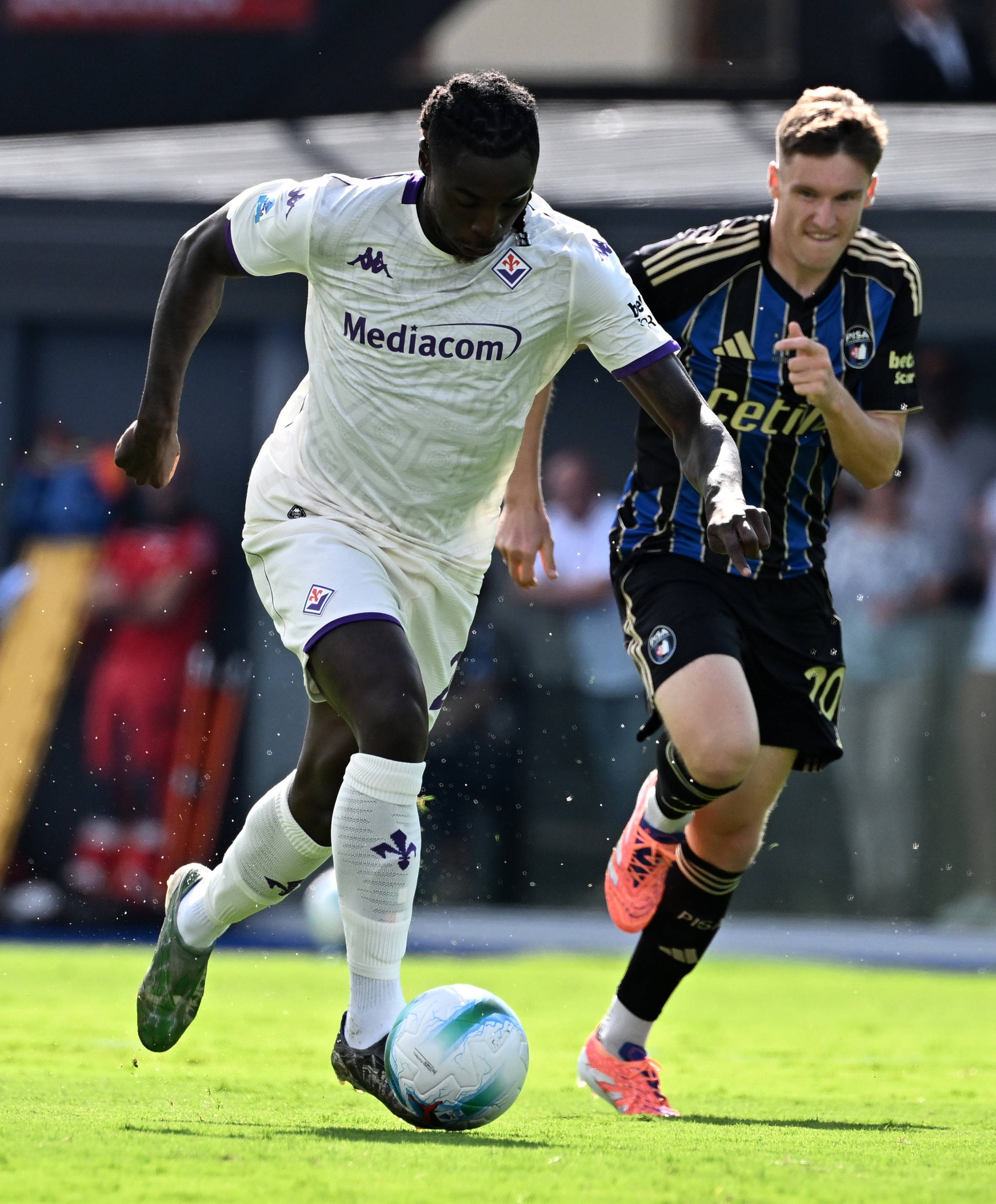9月28日,佛罗伦萨队球员基恩(左)与比萨队球员埃贝切尔在比赛中拼抢。 新华社发