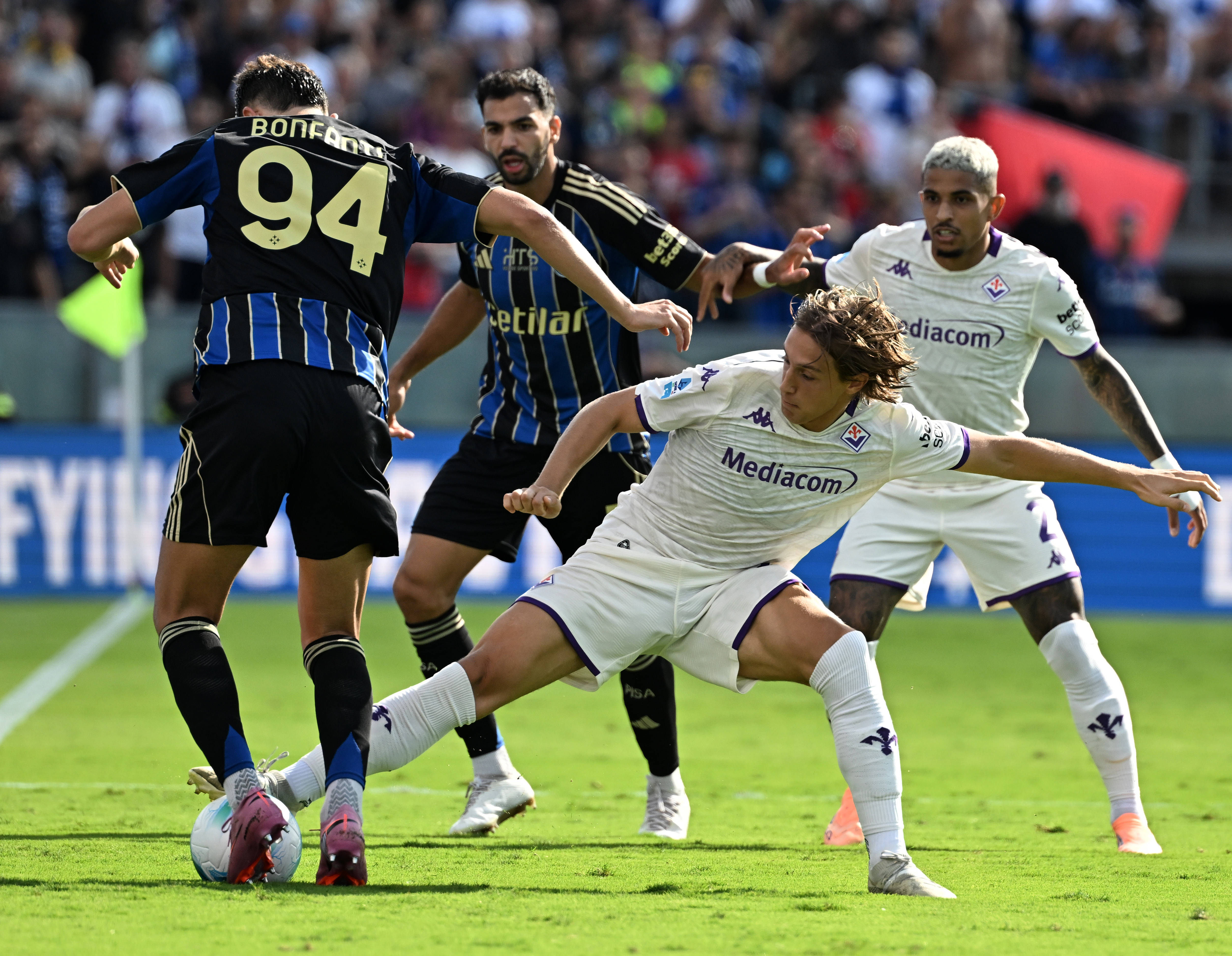 9月28日,佛罗伦萨队球员法齐尼(右)与比萨队球员邦凡蒂在比赛中拼抢。 新华社发