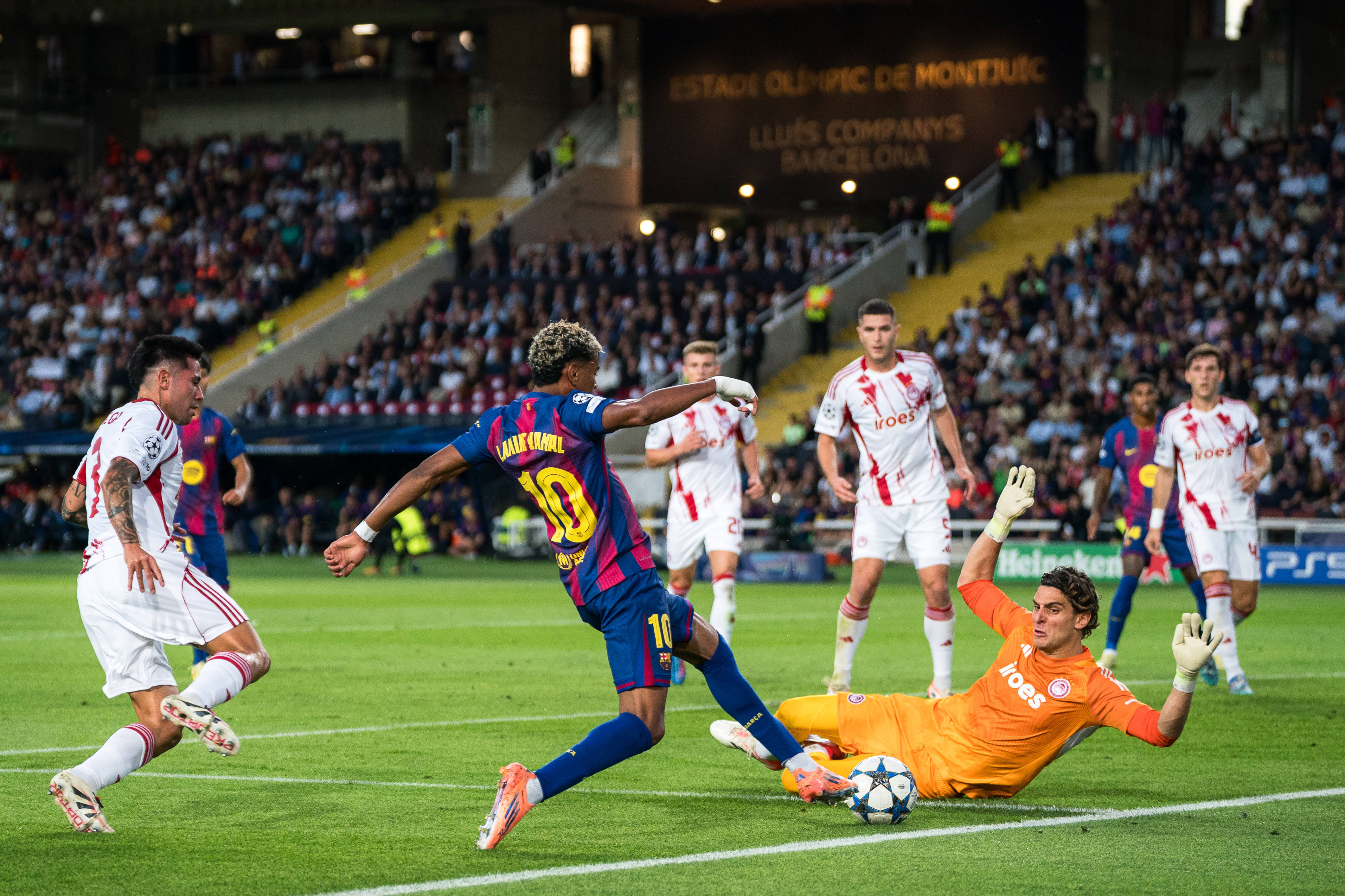 10月21日,巴塞罗那队球员亚马尔(左二)与奥林匹亚科斯队门将佐拉基斯在比赛中拼抢。 新华社发(胡安·戈萨摄)返回搜狐,查看更多