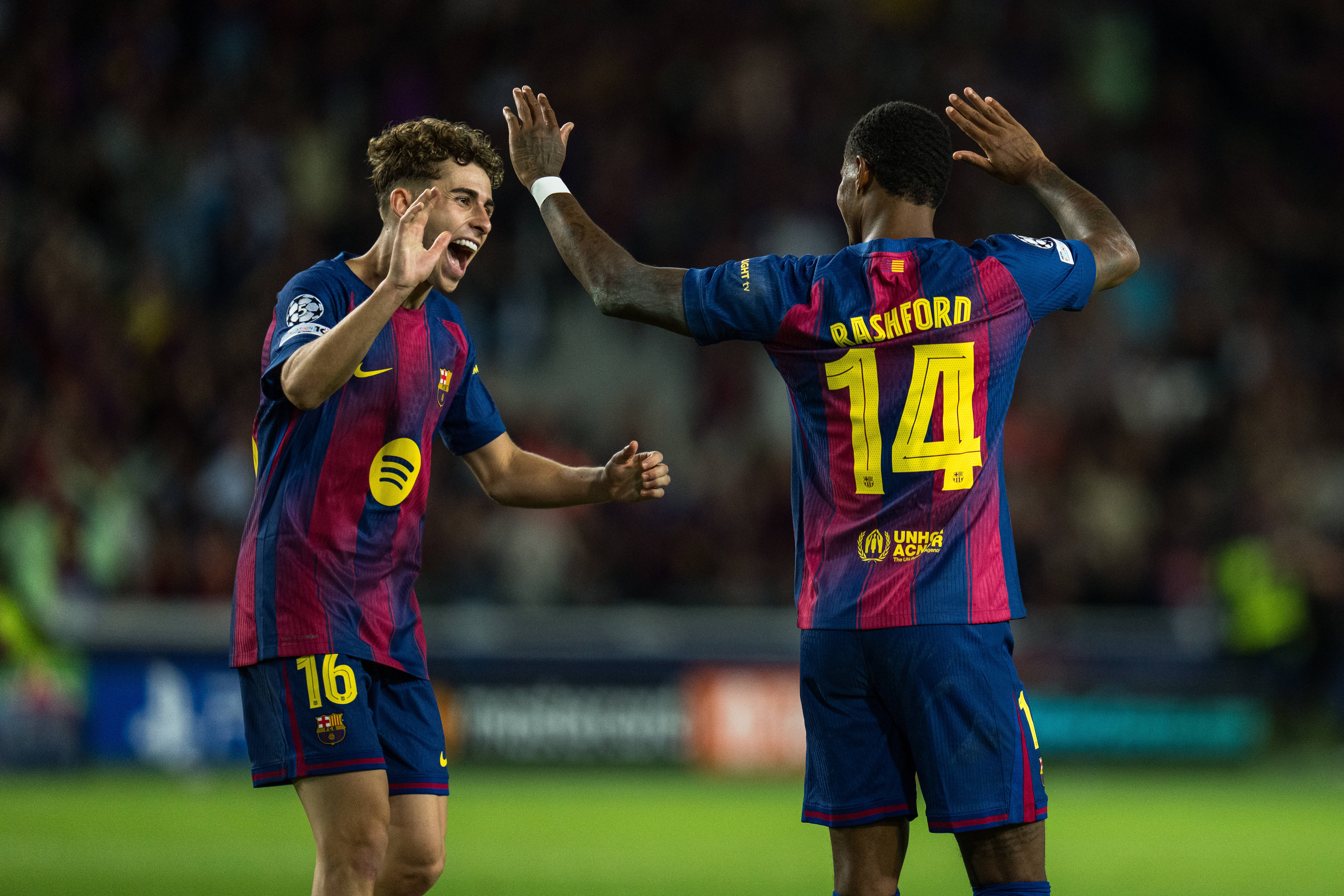 10月21日,巴塞罗那队球员拉什福德(右)和费尔明·洛佩斯在得分后庆祝。 新华社发(胡安·戈萨摄)