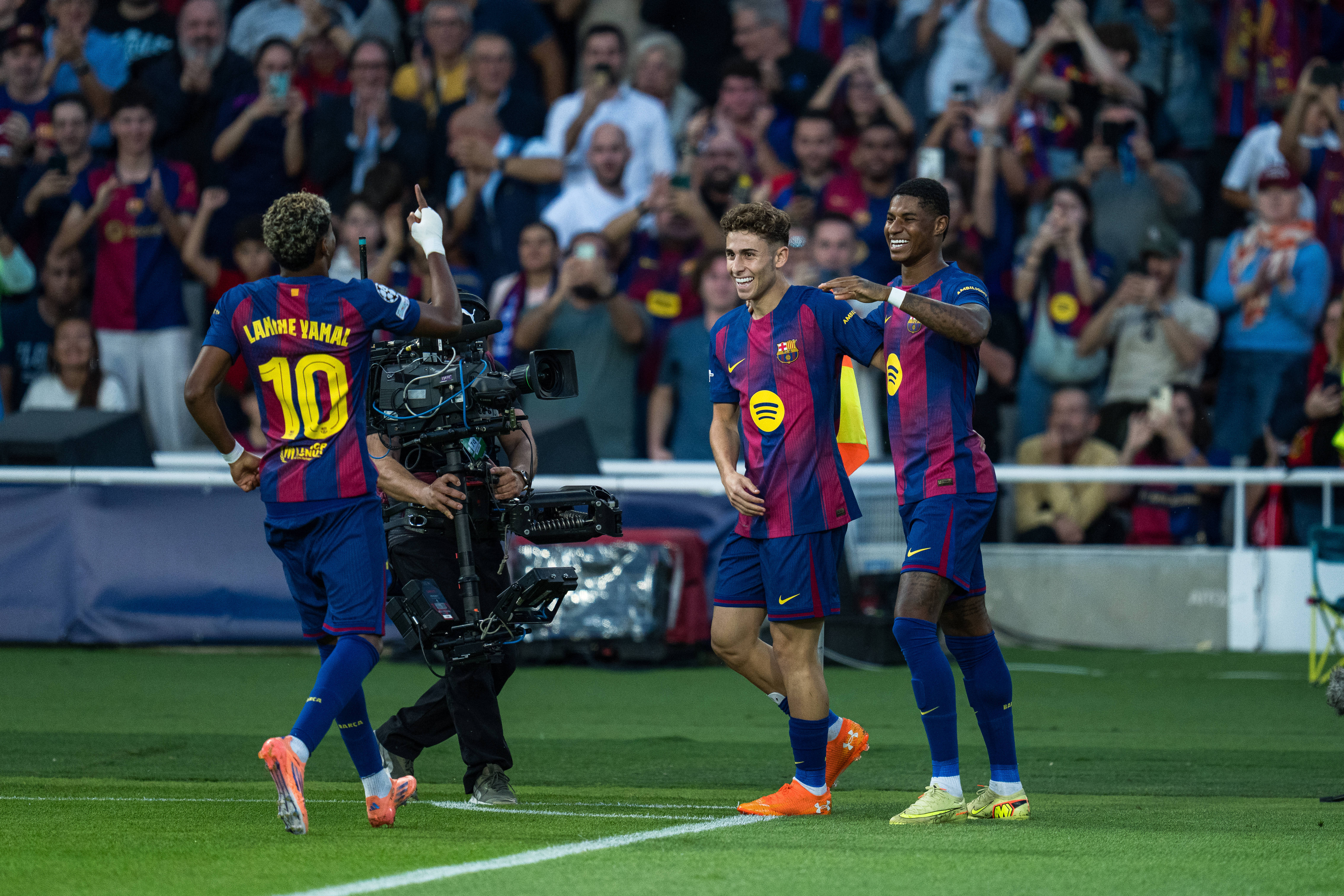 10月21日,巴塞罗那队球员拉什福德(右)和队友庆祝得分。 新华社发(胡安·戈萨摄)