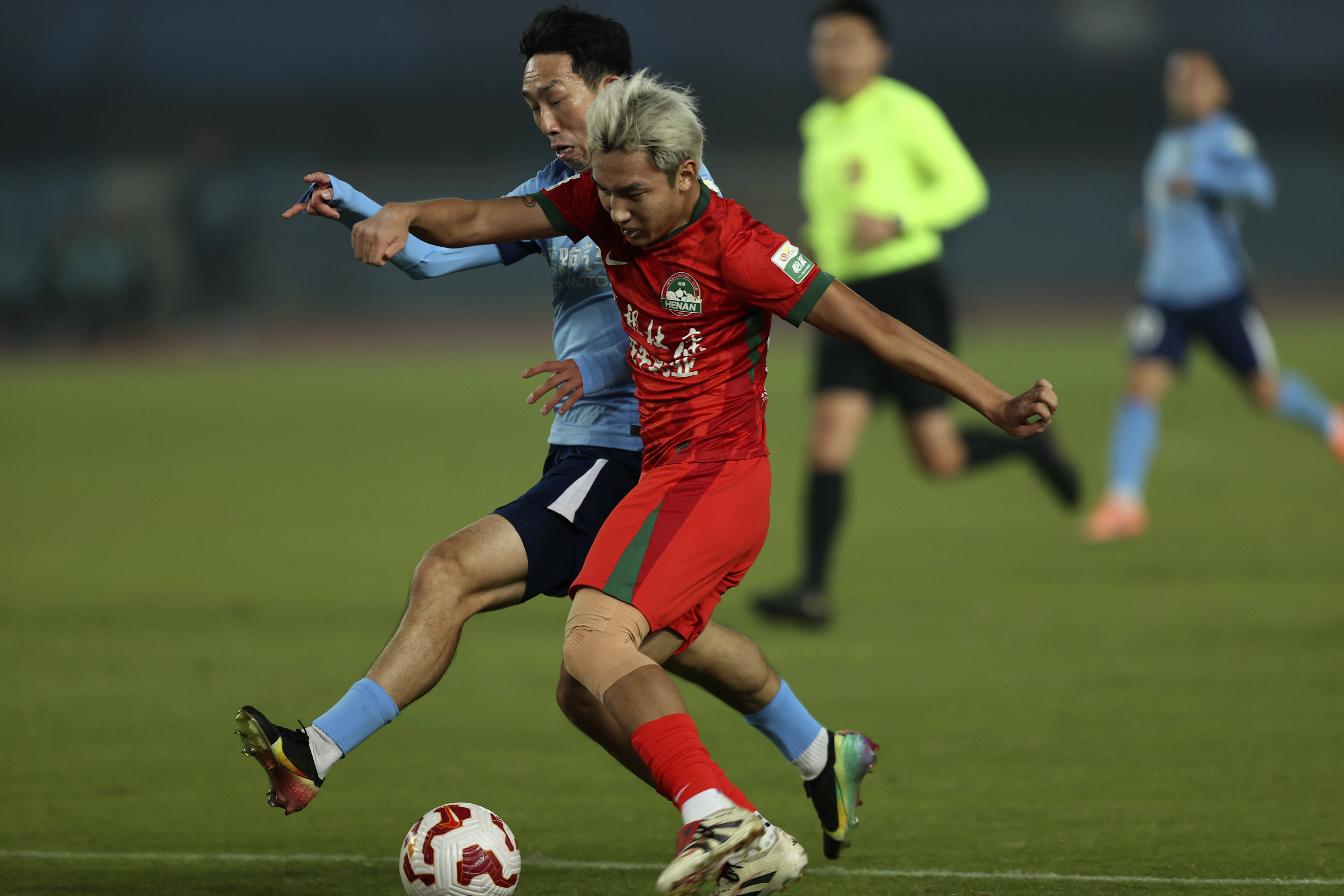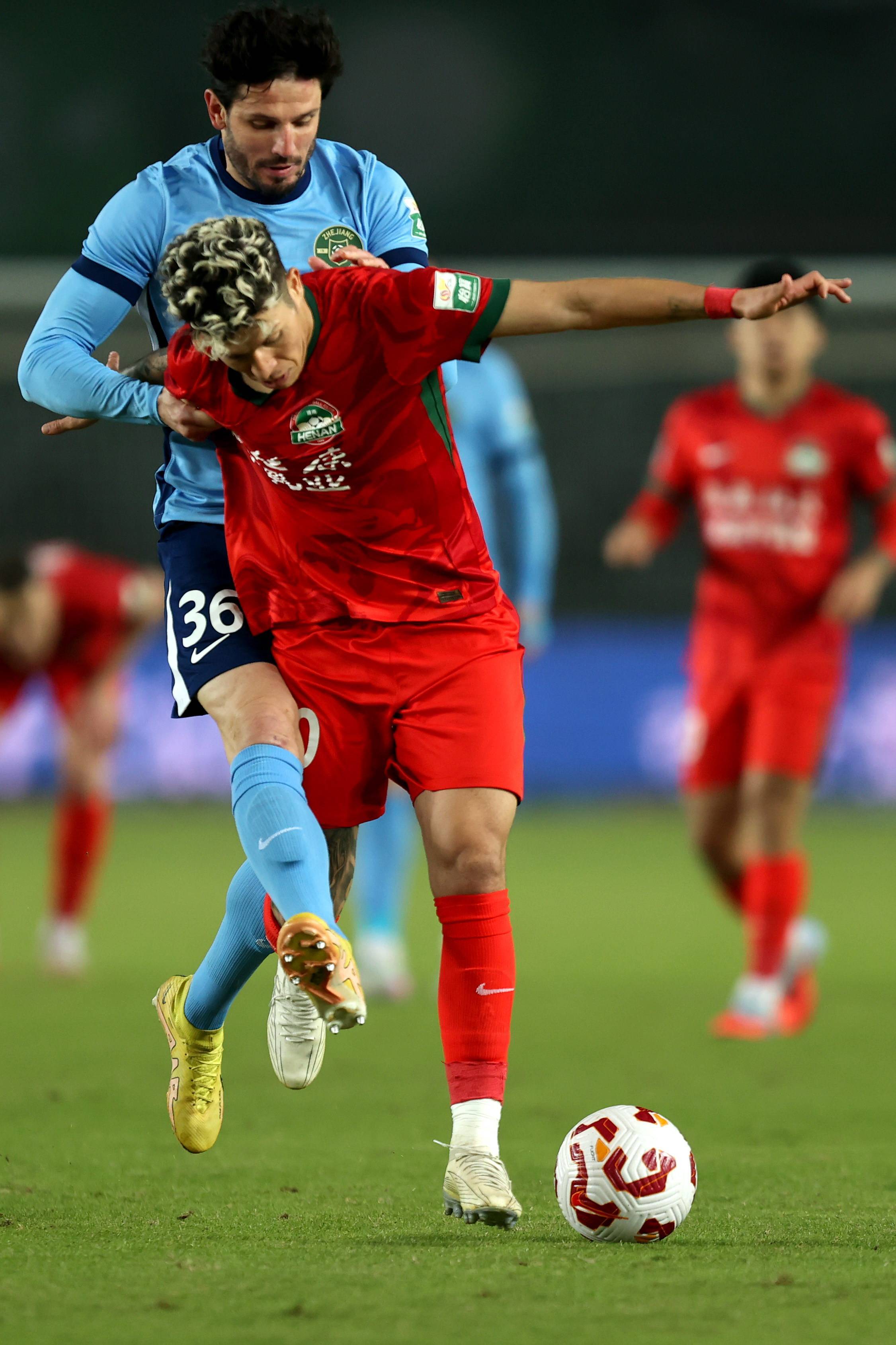 10月25日,河南俱乐部酒祖杜康队球员纳萨里奥(前)与浙江俱乐部绿城队球员卢卡斯在比赛中拼抢。 新华社发(袁晓强摄)