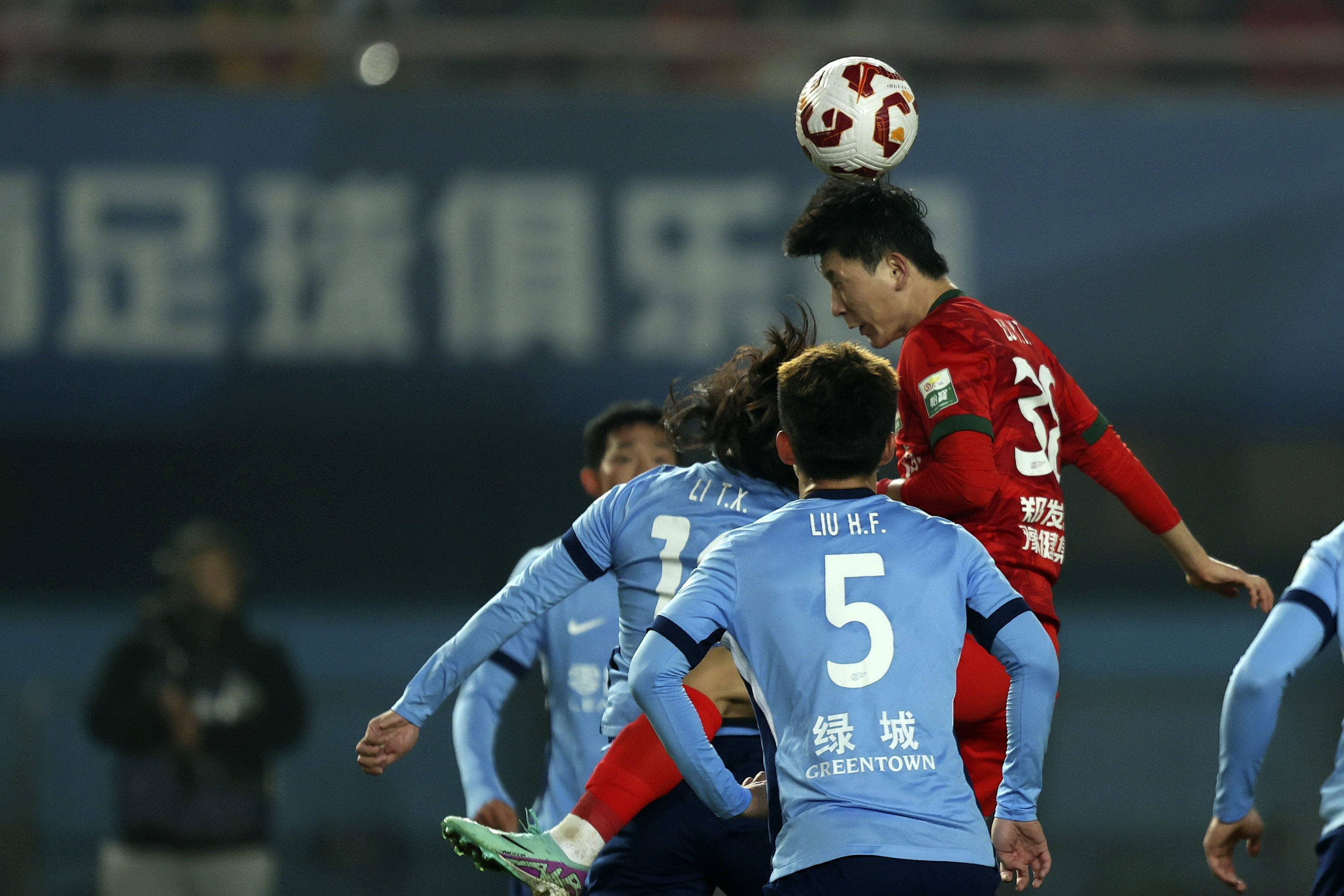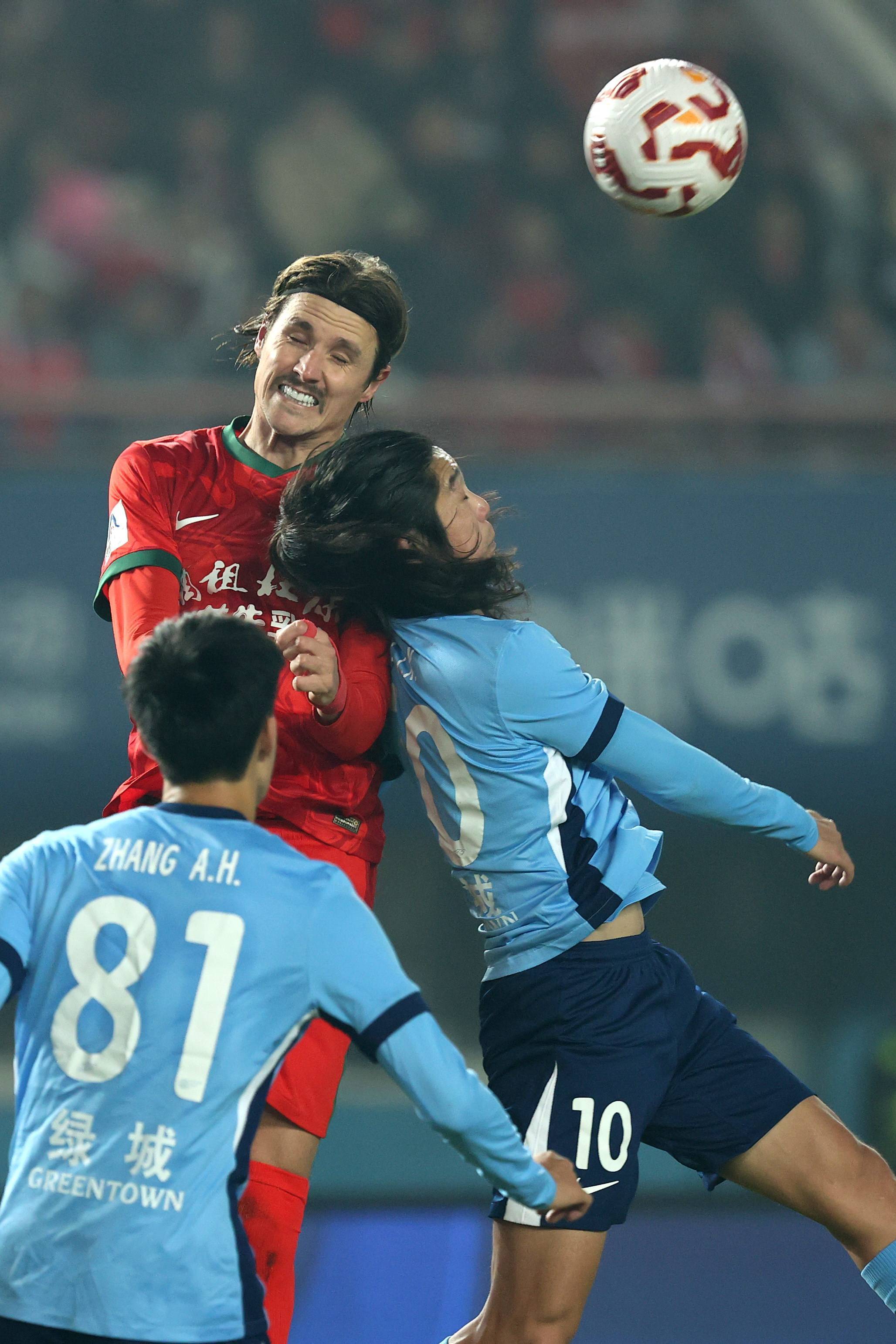 10月25日,河南俱乐部酒祖杜康队球员迈达纳(上左)与浙江俱乐部绿城队球员李提香(上右)在比赛中争顶。 新华社发(袁晓强摄)返回搜狐,查看更多