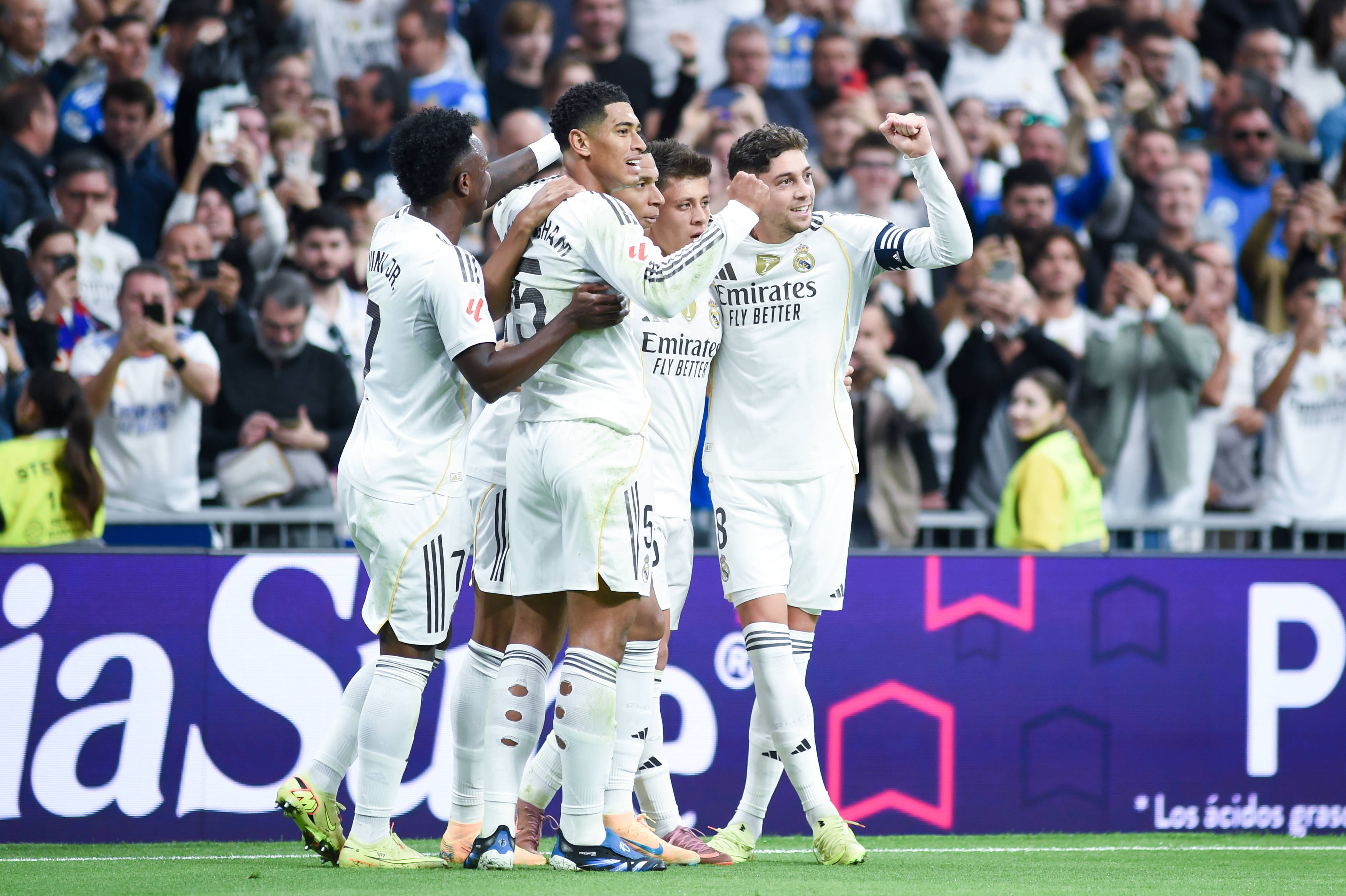 10月26日,皇家马德里队球员姆巴佩(左)和贝林厄姆(右)在比赛中庆祝进球。 新华社发(古斯塔沃·巴连特摄)