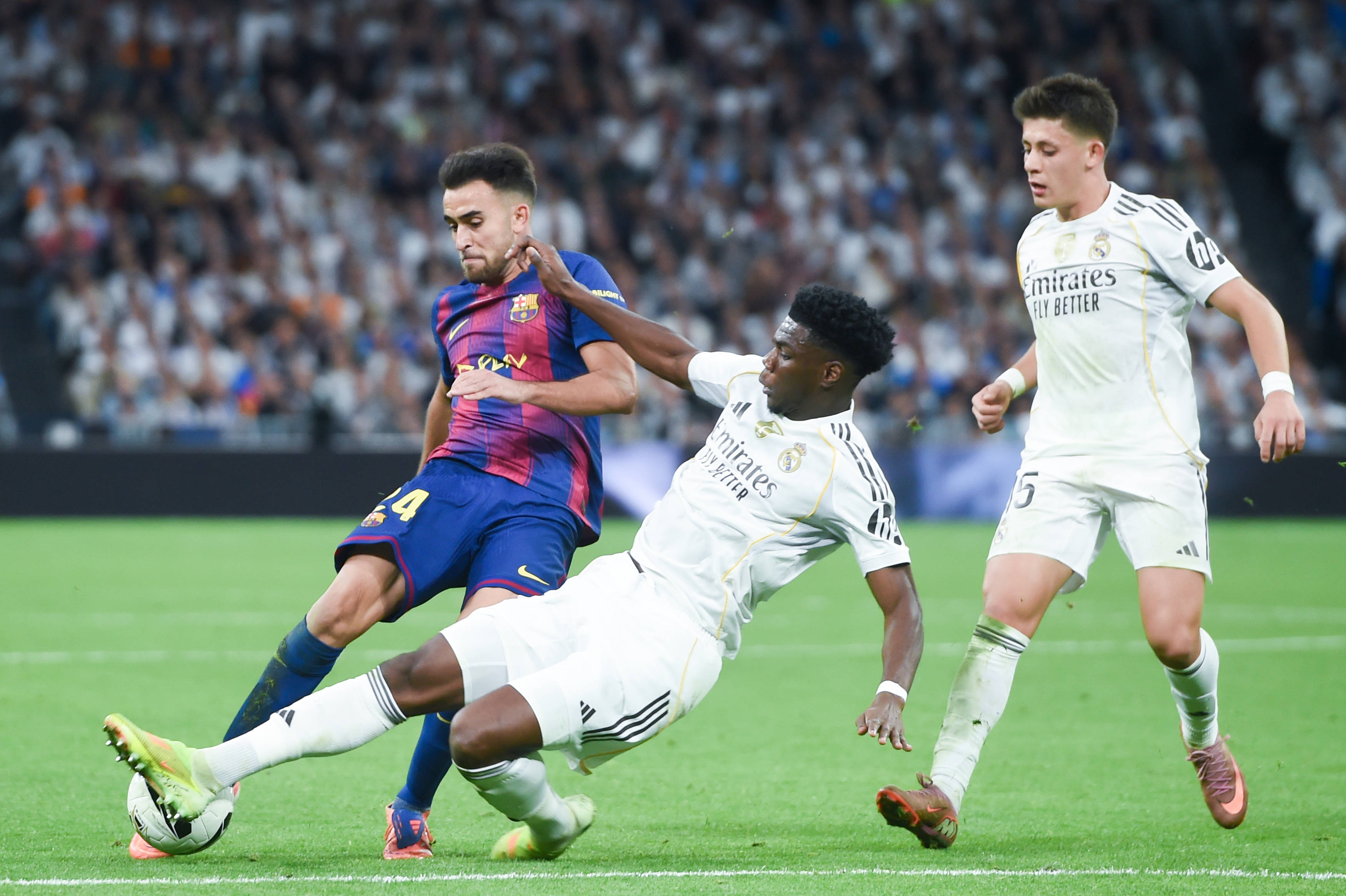 10月26日,皇家马德里队球员楚阿梅尼(中)在比赛中防守巴塞罗那队球员埃里克·加西亚(左)。 新华社发(古斯塔沃·巴连特摄)