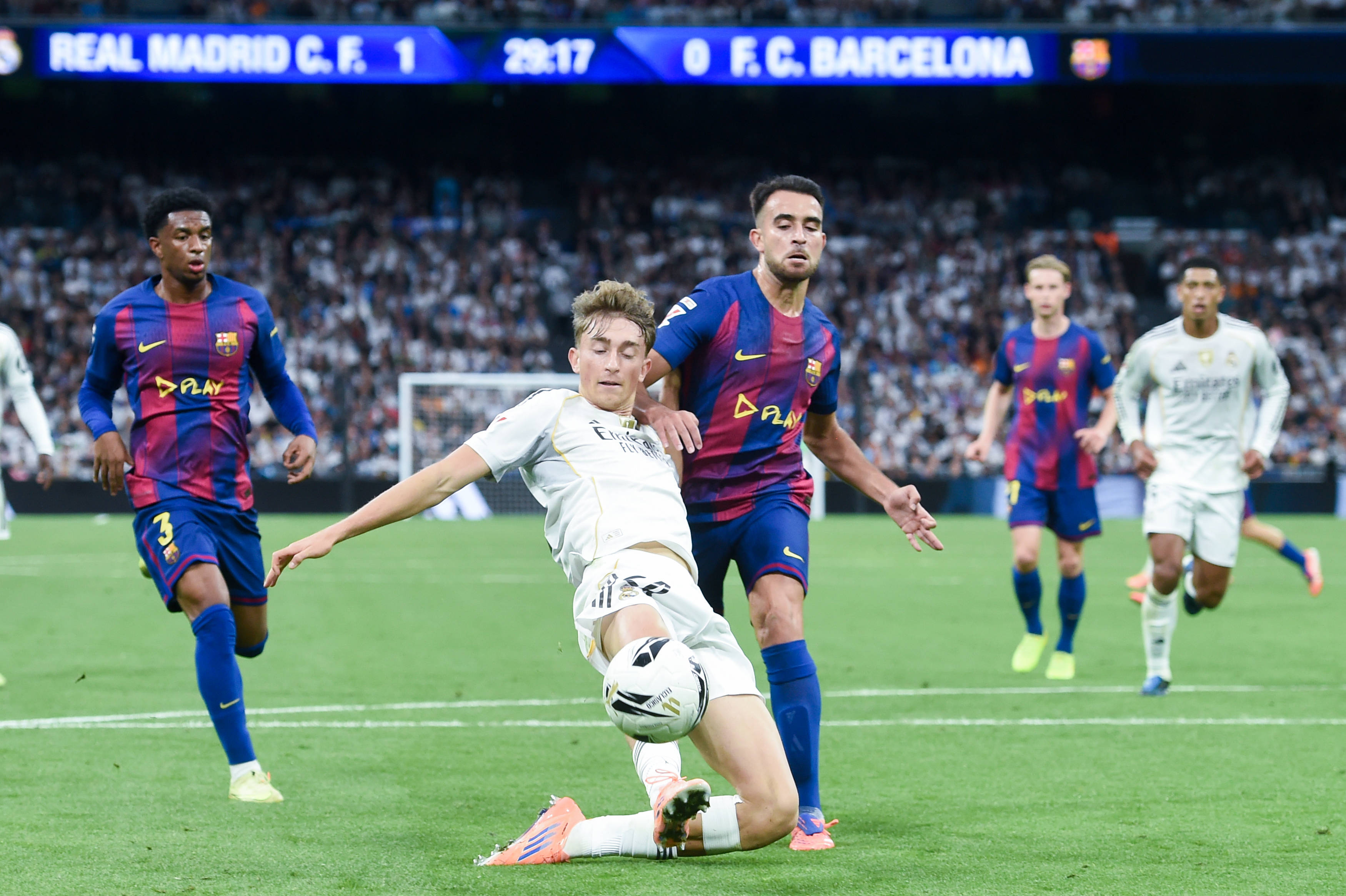10月26日,皇家马德里队球员卡雷拉斯(左)和巴塞罗那队球员费尔明·洛佩斯在比赛中拼抢。 新华社发(古斯塔沃·巴连特摄)