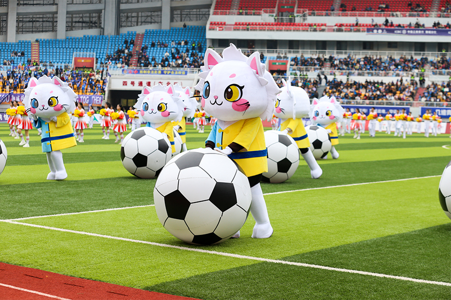 随着指引,十名丝喵人偶手持足球步入场地,与220名演员共同演绎《最好的舞台》。丝喵人偶们跟随节奏跑动跳跃,不时围圈表演踢球,灵动的姿态与热烈的歌舞相映成趣。数百个五彩缤纷的气球腾空而起,在体育场上空绘出绚丽图景,为这场足球盛宴拉开序幕。