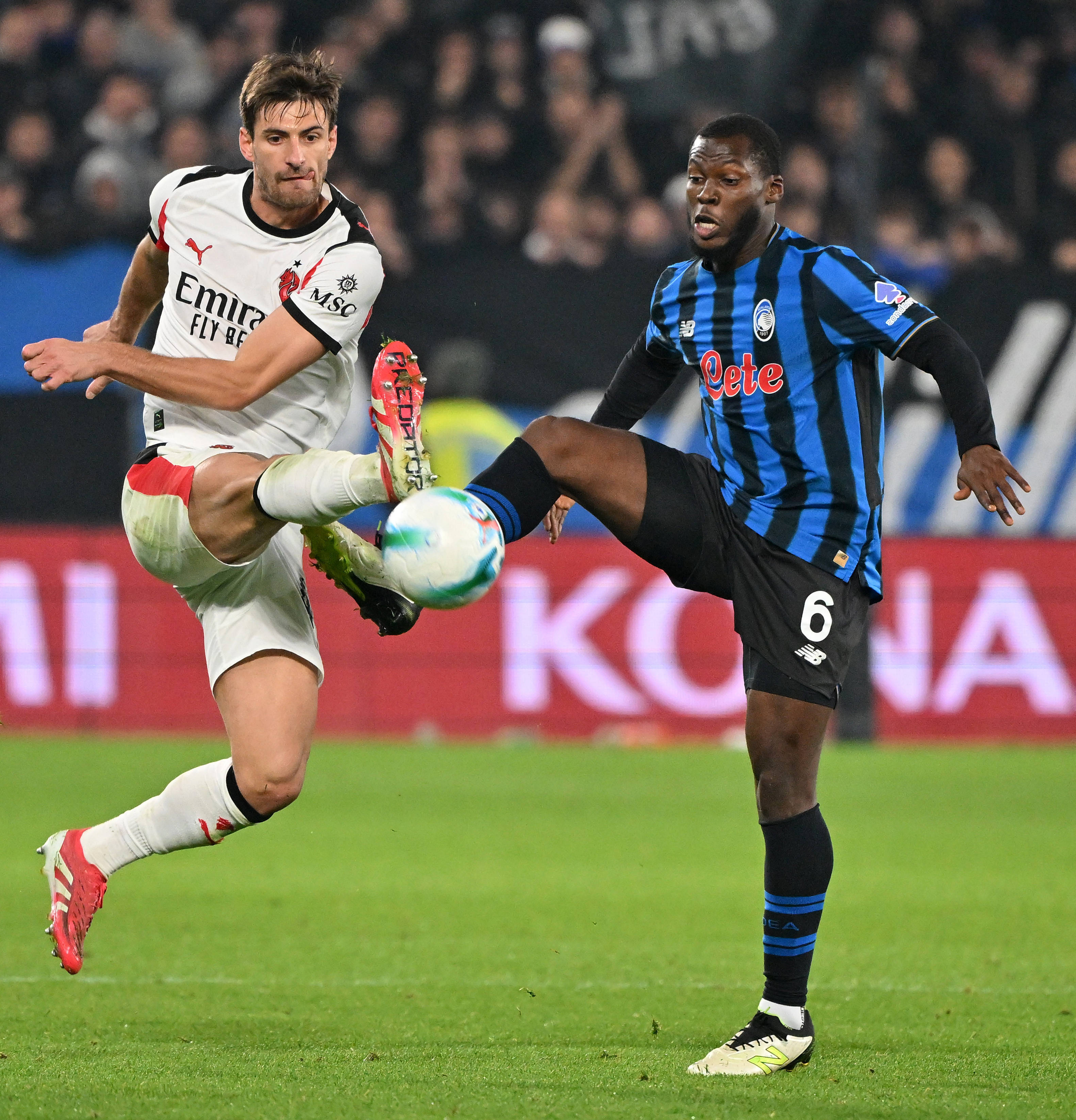 10月28日,AC米兰队球员加比亚(左)与亚特兰大队球员穆萨在比赛中拼抢。 新华社发(阿尔贝托·林格利亚摄)