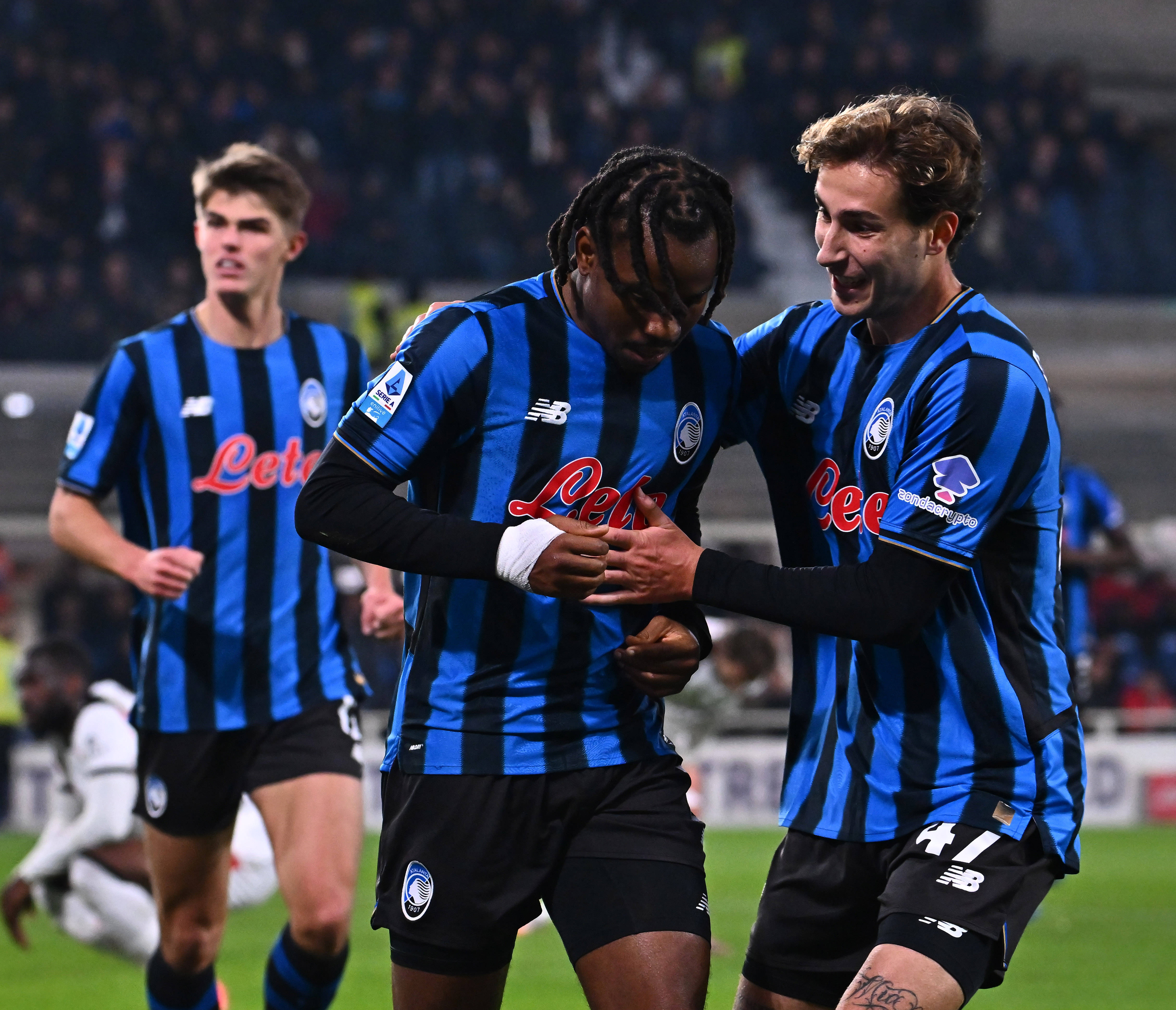 10月28日,亚特兰大队球员卢克曼(中)与队友贝尔纳斯科尼庆祝进球。 新华社发(阿尔贝托·林格利亚摄)