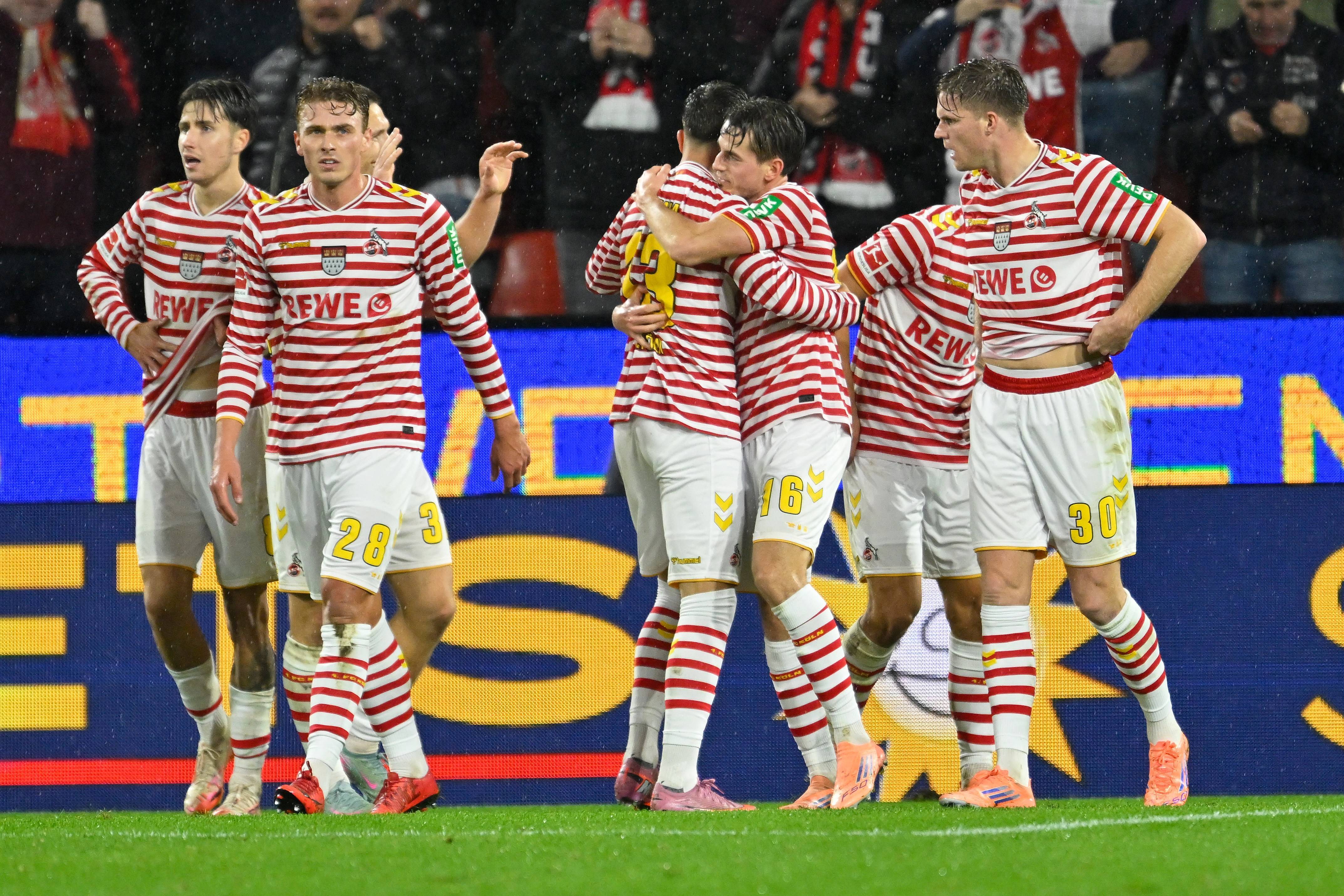 11月2日,科隆队球员阿赫(前)庆祝得分。 新华社发(乌尔里希·胡夫纳格尔摄)