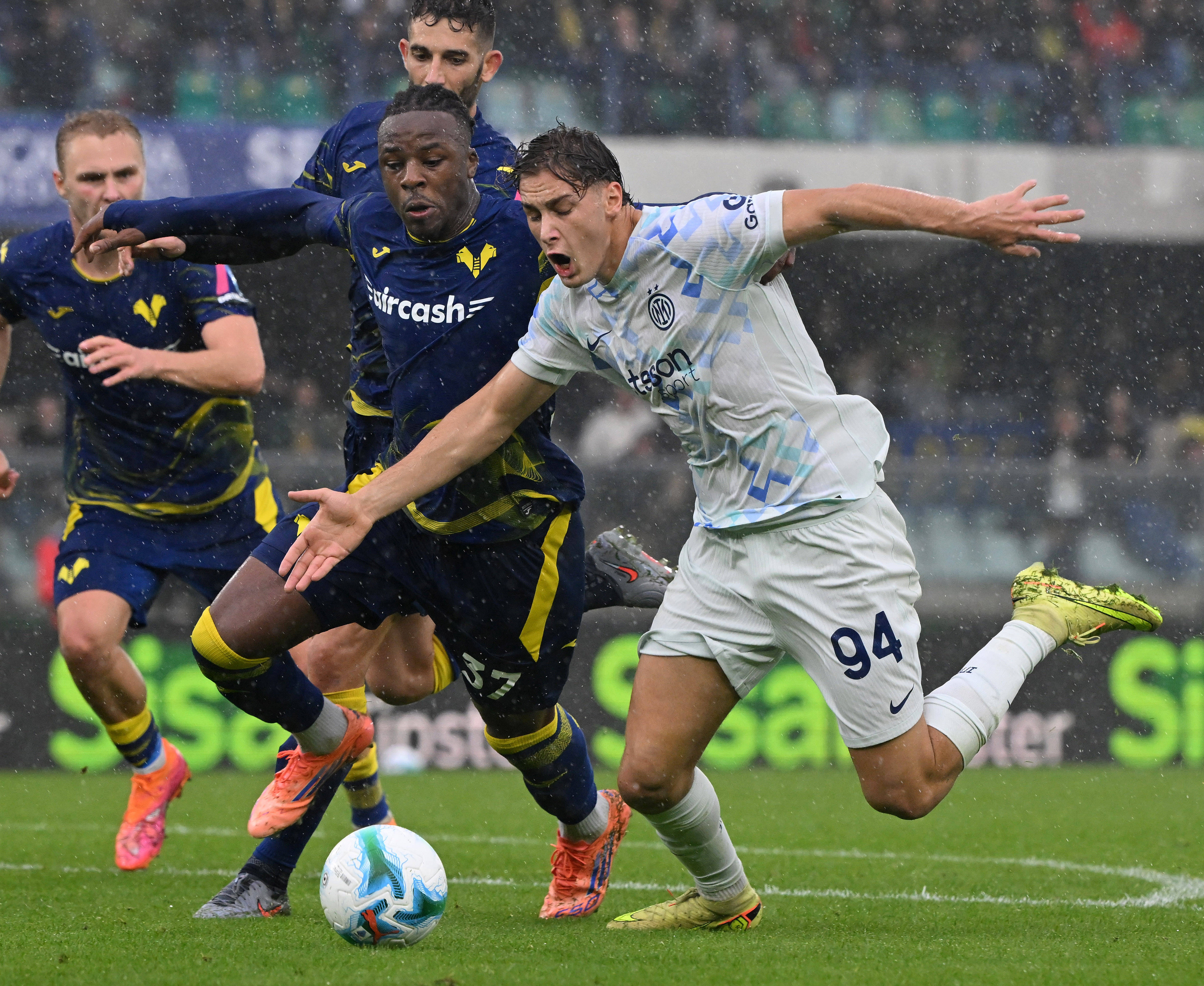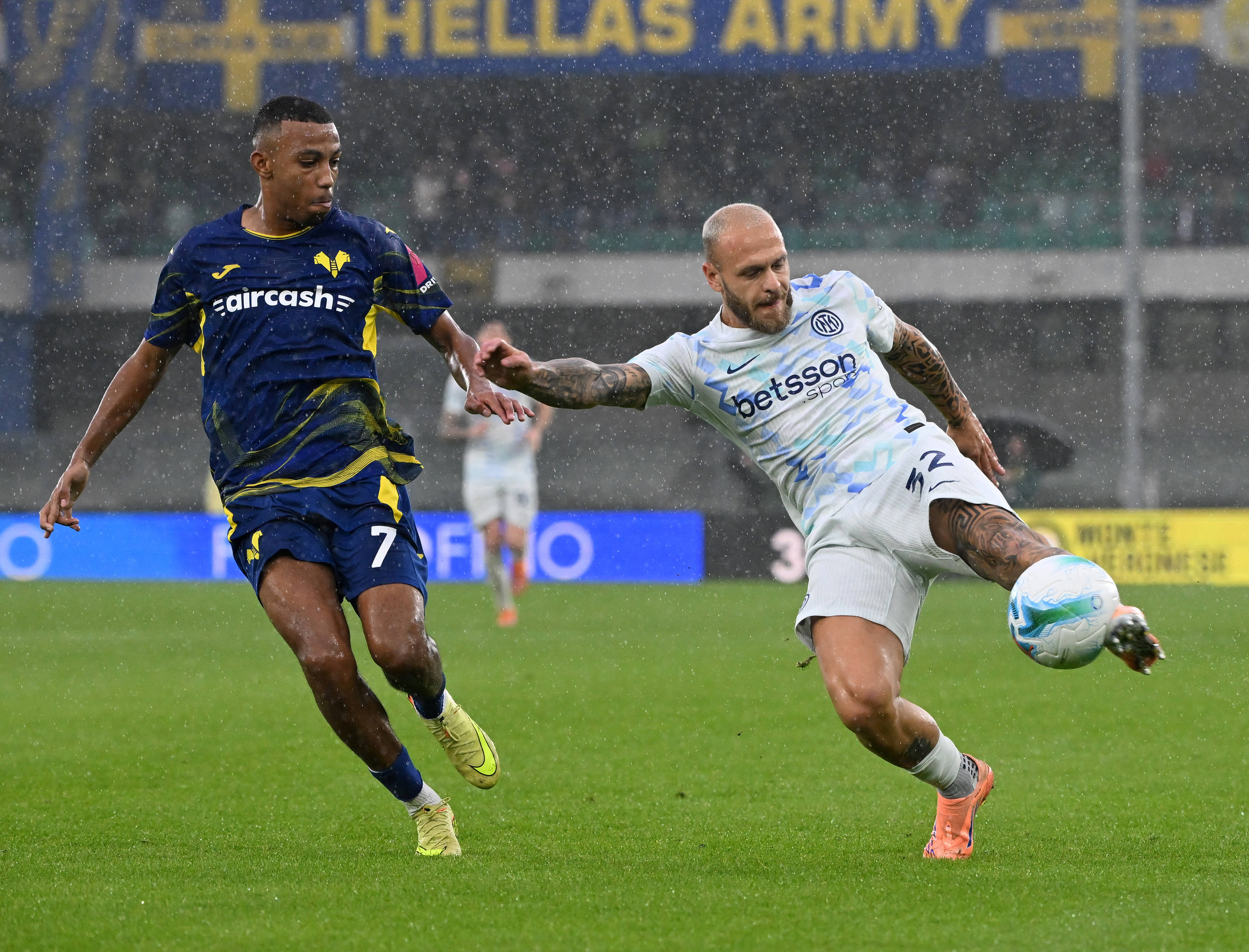 11月2日,国际米兰队球员埃斯波西托(右)与维罗纳队球员贝拉-科沙在比赛中拼抢。 新华社发(迭戈摄)