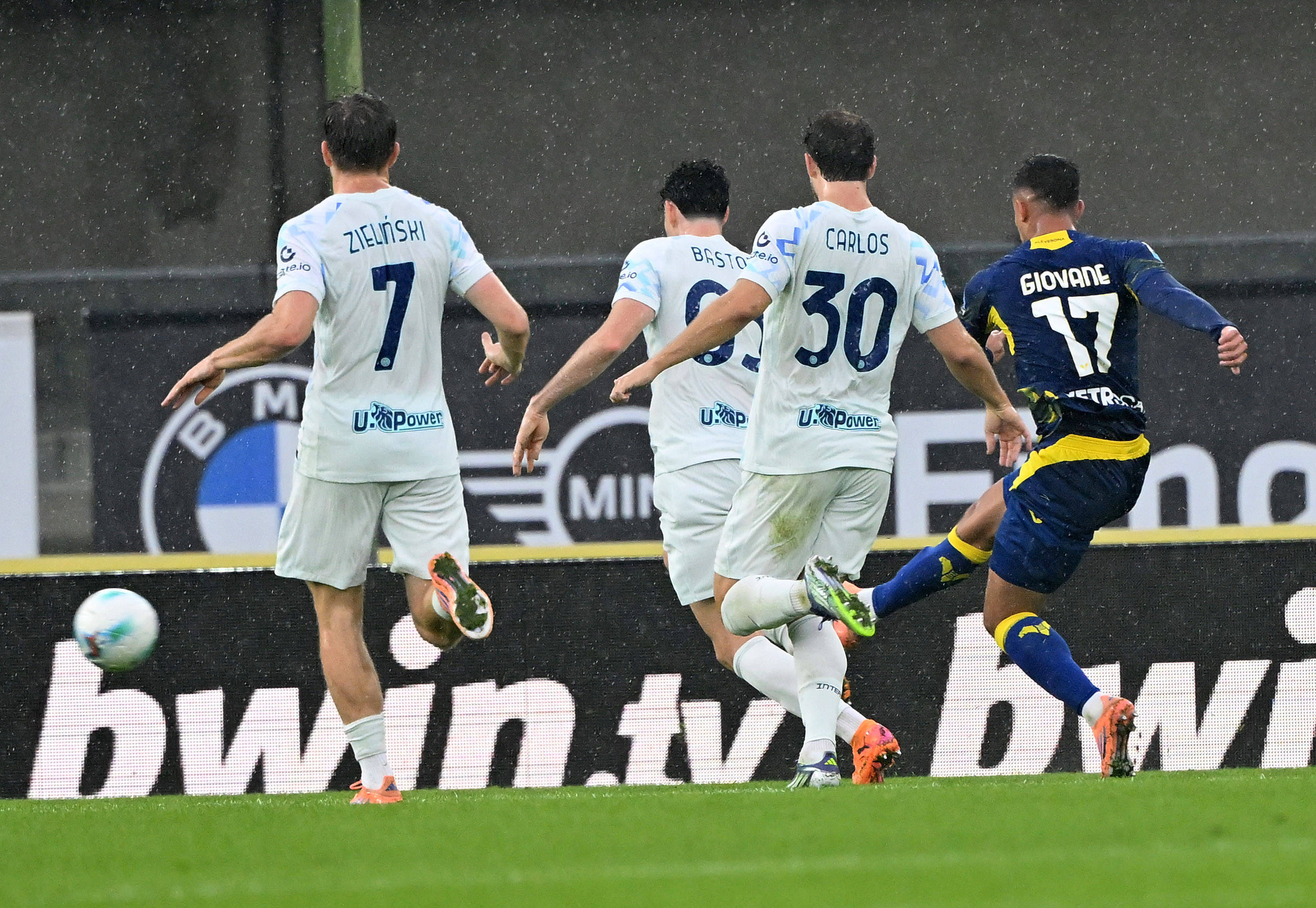 11月2日,维罗纳队球员焦瓦内(右一)在比赛中射门得分。 新华社发(迭戈摄)