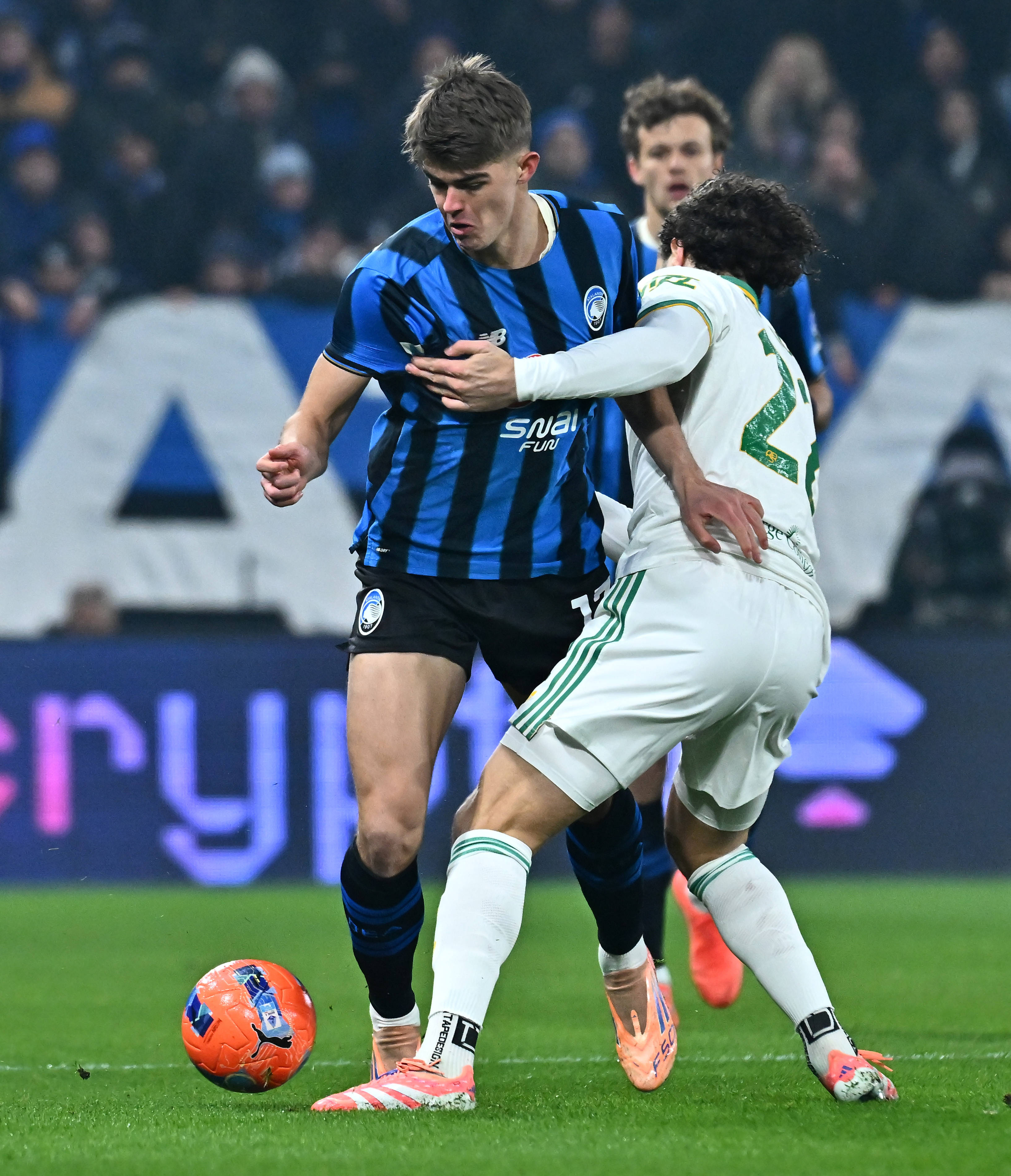1月3日,亚特兰大队球员希恩(左)与罗马队球员多夫比克在比赛中拼抢。 新华社发(阿尔贝托·林格利亚摄)