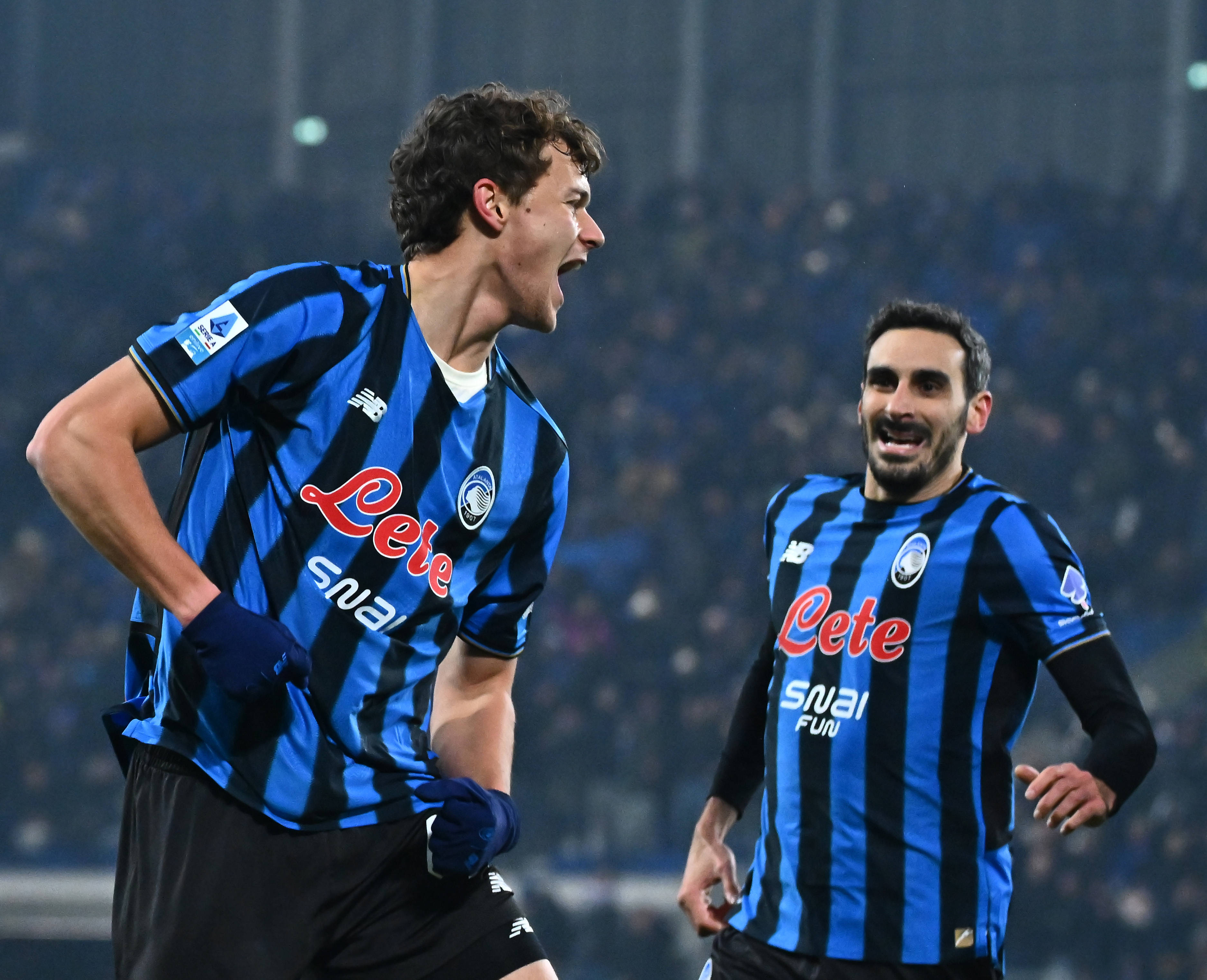 1月3日,亚特兰大队球员斯卡尔维尼(左)庆祝进球。 新华社发(阿尔贝托·林格利亚摄)