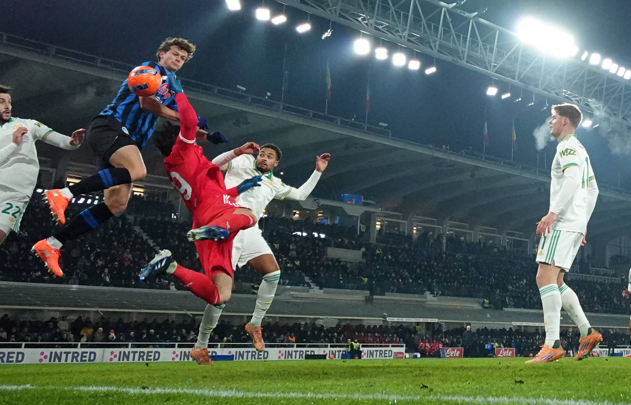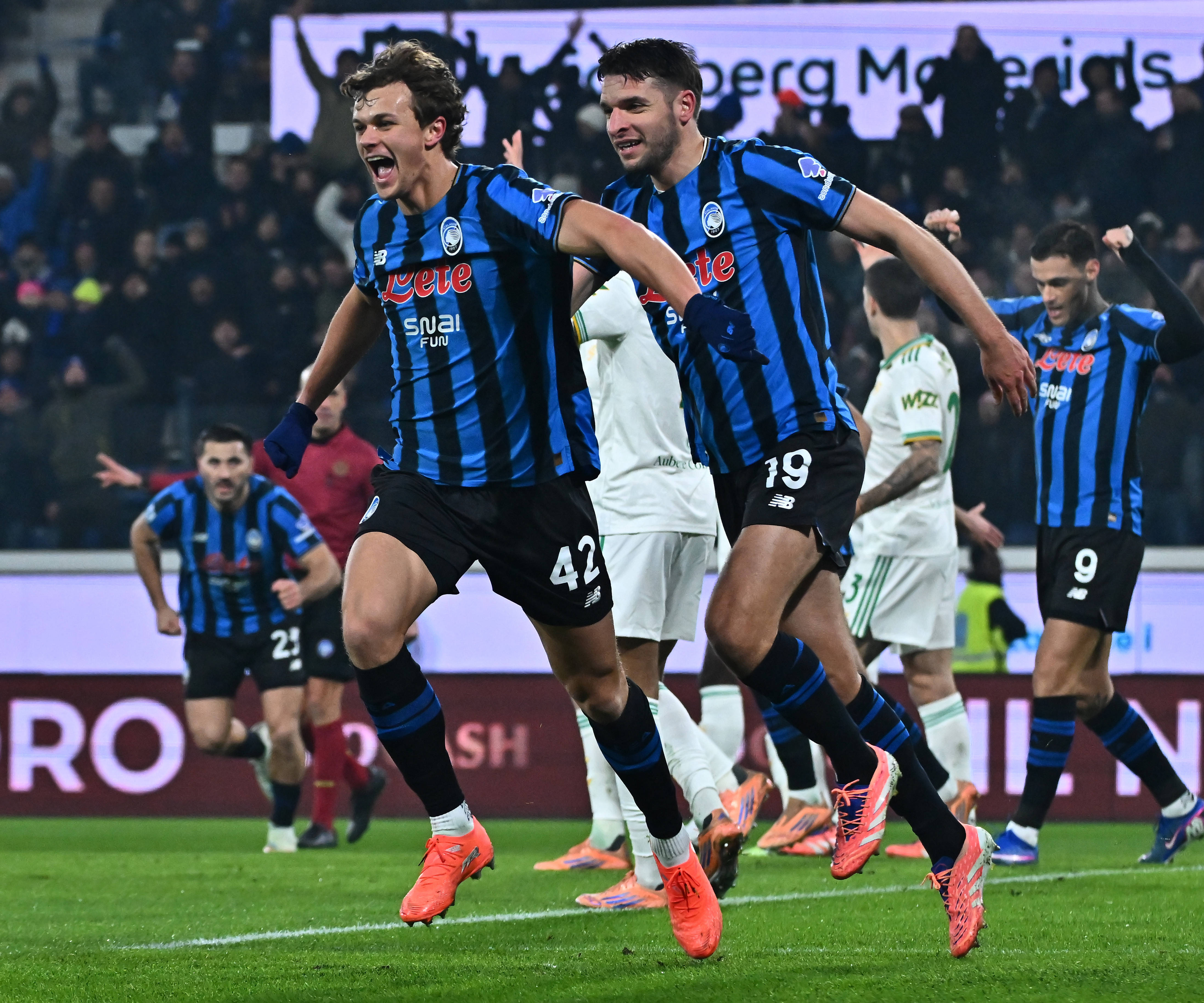 1月3日,亚特兰大队球员斯卡尔维尼(右三)庆祝进球。 新华社发(阿尔贝托·林格利亚摄)