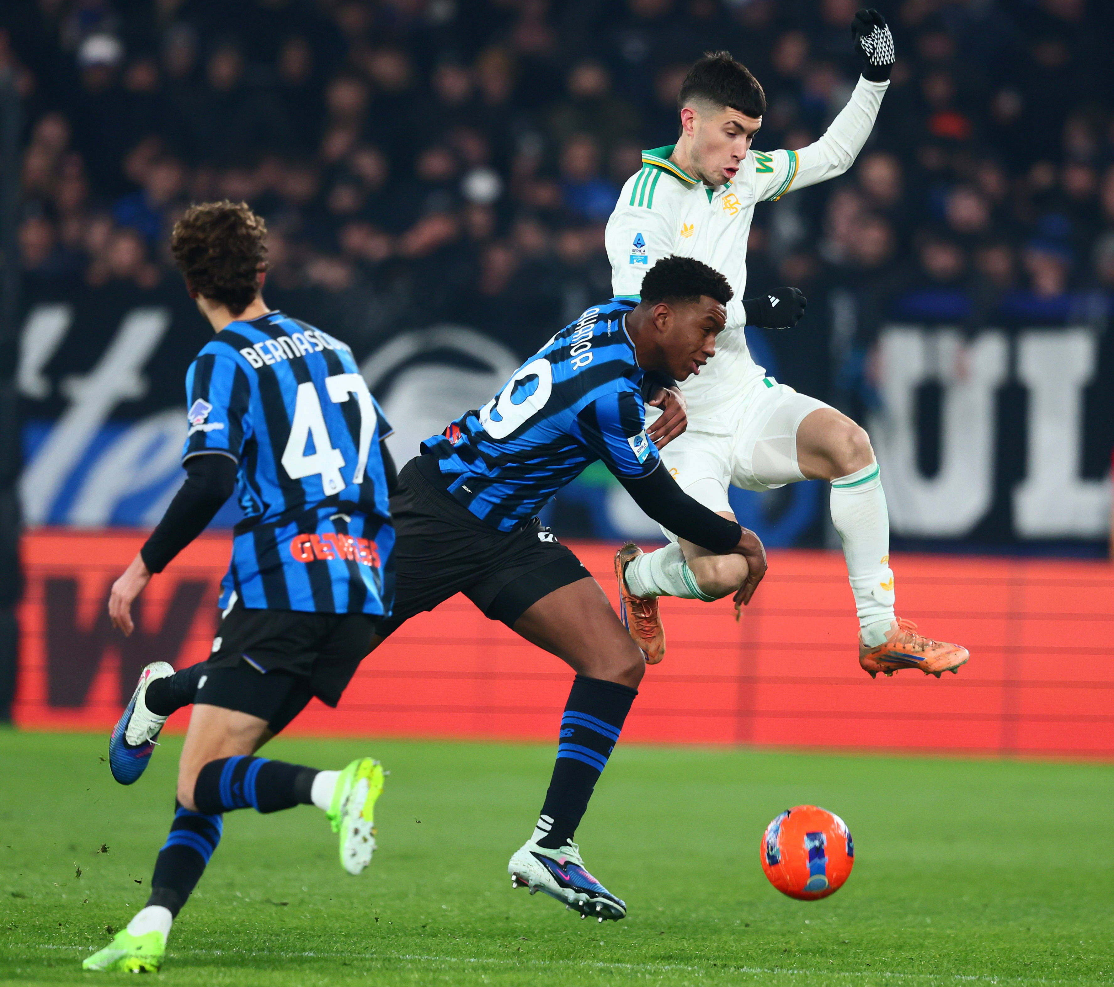 1月3日,亚特兰大队球员贝尔纳斯科尼(左)、阿哈诺尔(中)与罗马队球员苏莱在比赛中拼抢。 新华社发(阿尔贝托·林格利亚摄)
