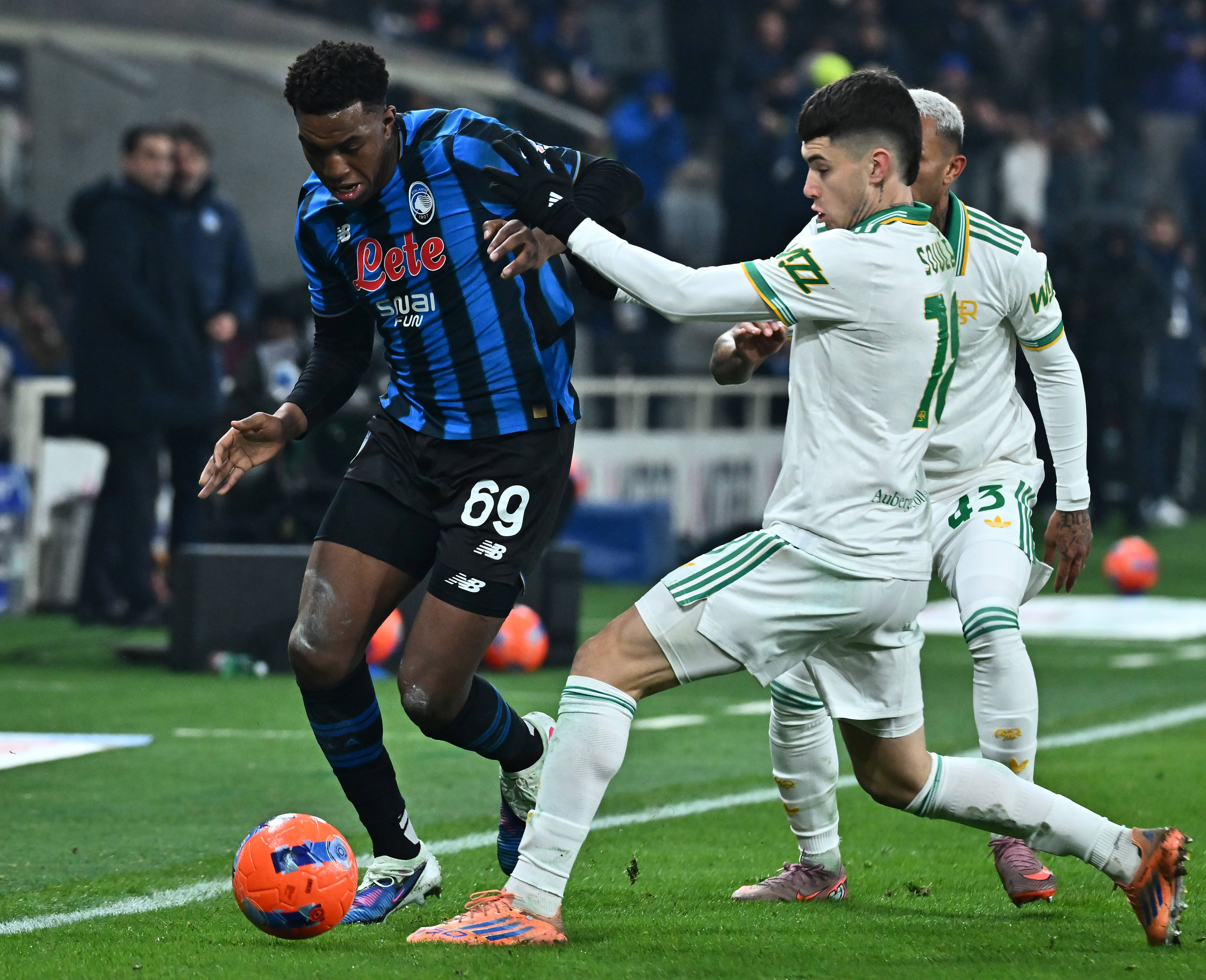 1月3日,亚特兰大队球员阿哈诺尔(左)与罗马队球员苏莱(右前)在比赛中拼抢。 新华社发(阿尔贝托·林格利亚摄)