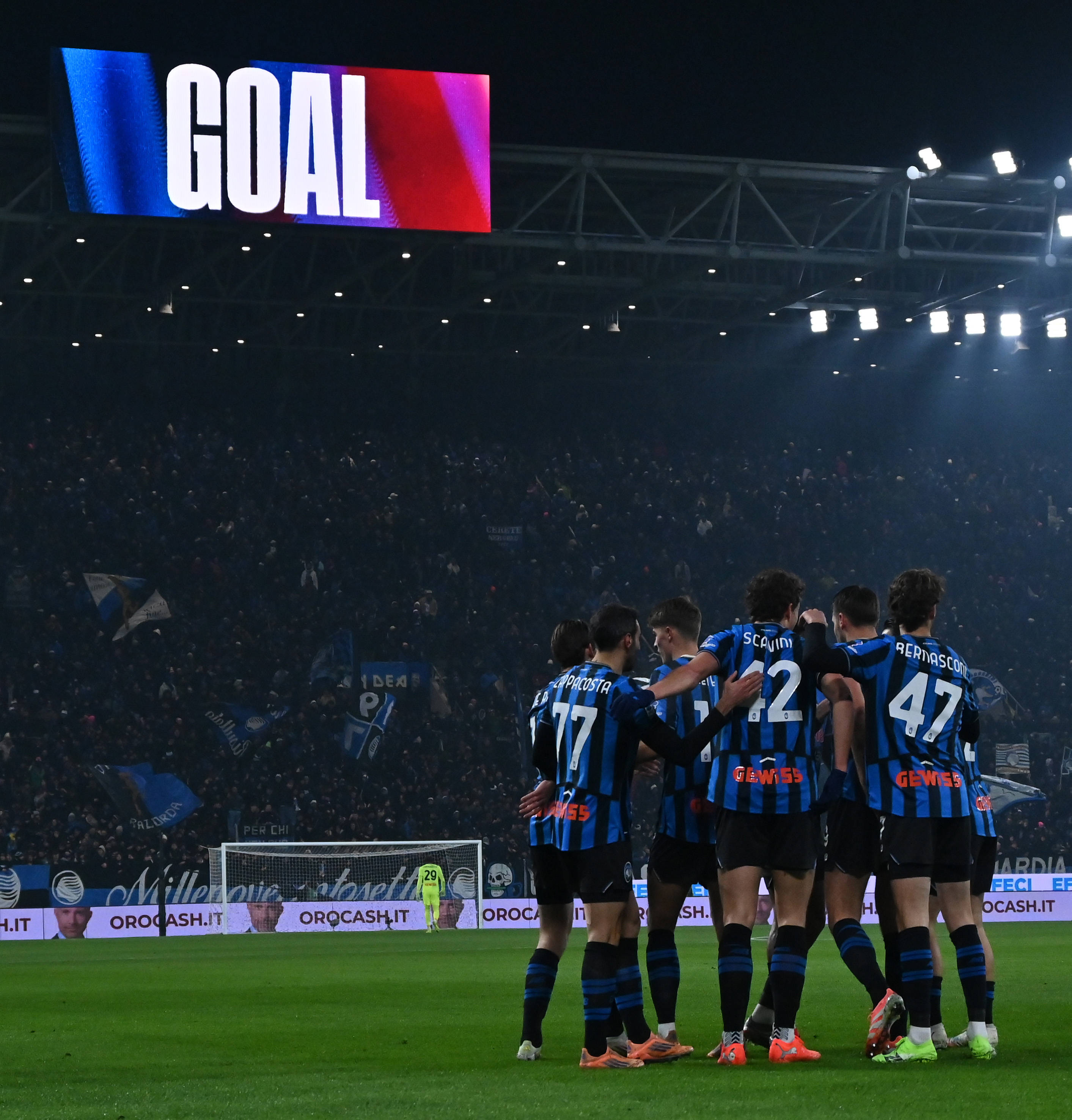 1月3日,亚特兰大队球员斯卡尔维尼(左二)庆祝进球。 新华社发(阿尔贝托·林格利亚摄)