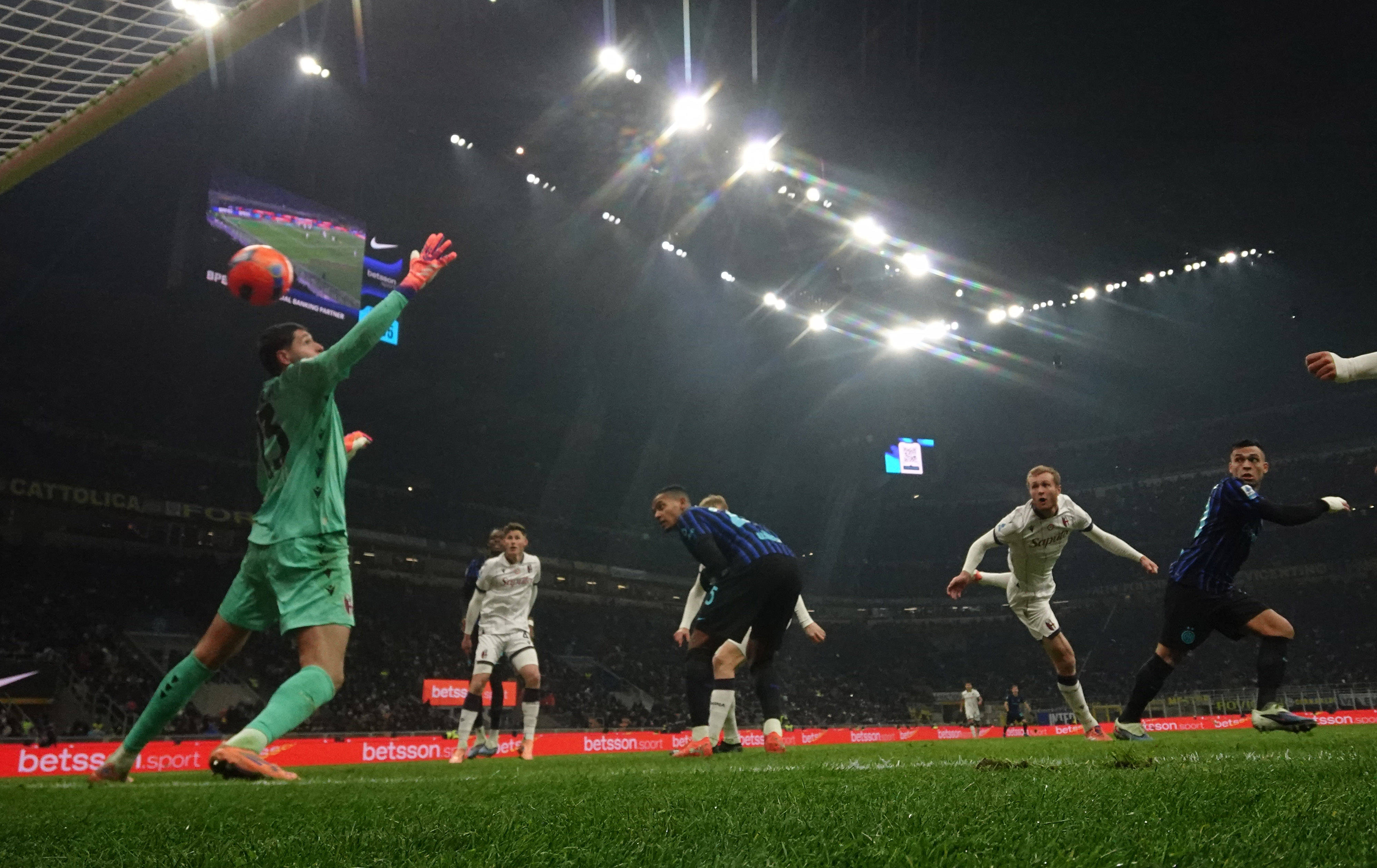 1月4日,国际米兰队球员劳塔罗·马丁内斯(右一)头球攻门得分。 新华社发(阿尔贝托·林格利亚摄)