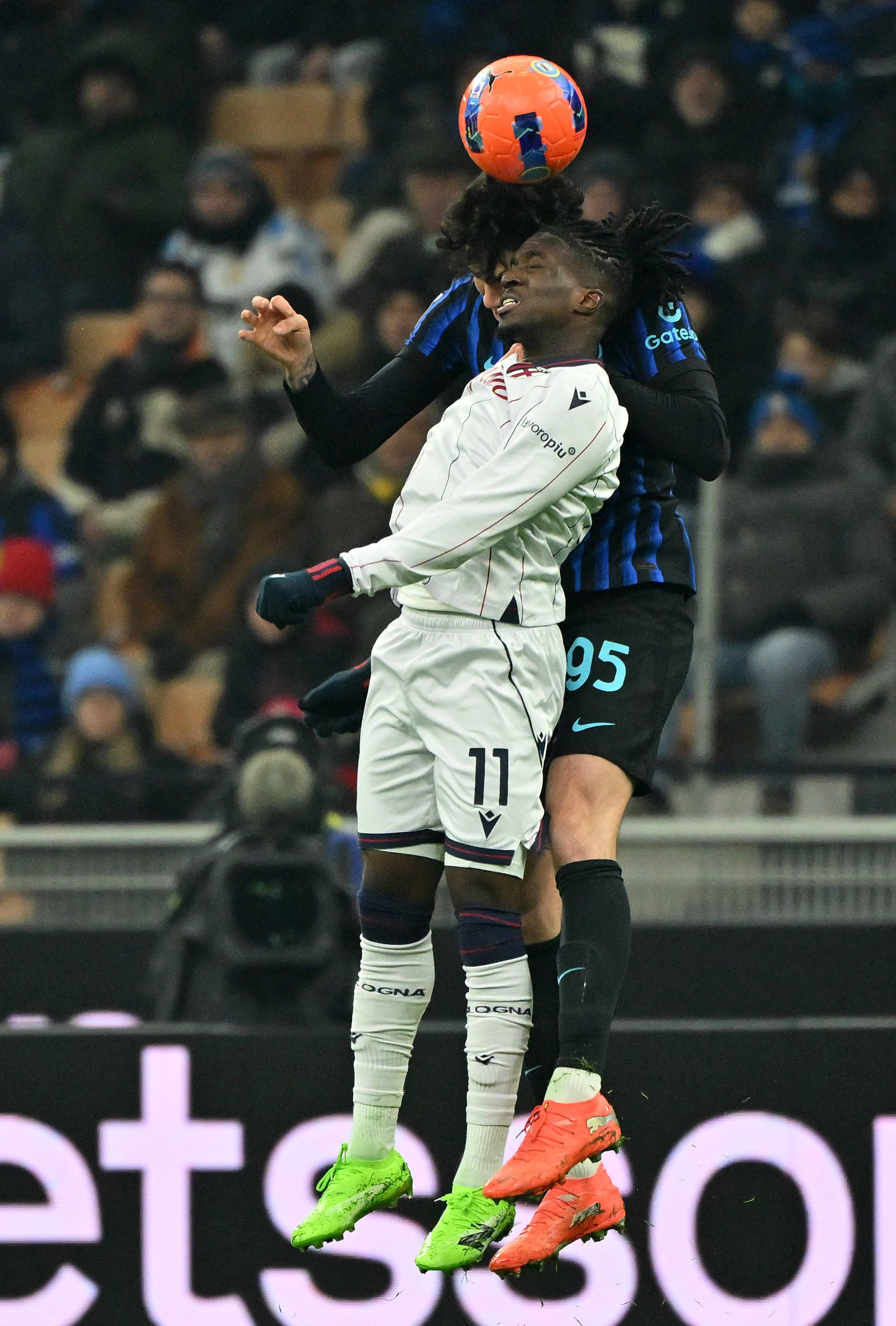 1月4日,国际米兰队球员图拉姆(左)与博洛尼亚队球员卢库米在比赛中争顶。 新华社发(阿尔贝托·林格利亚摄)返回搜狐,查看更多