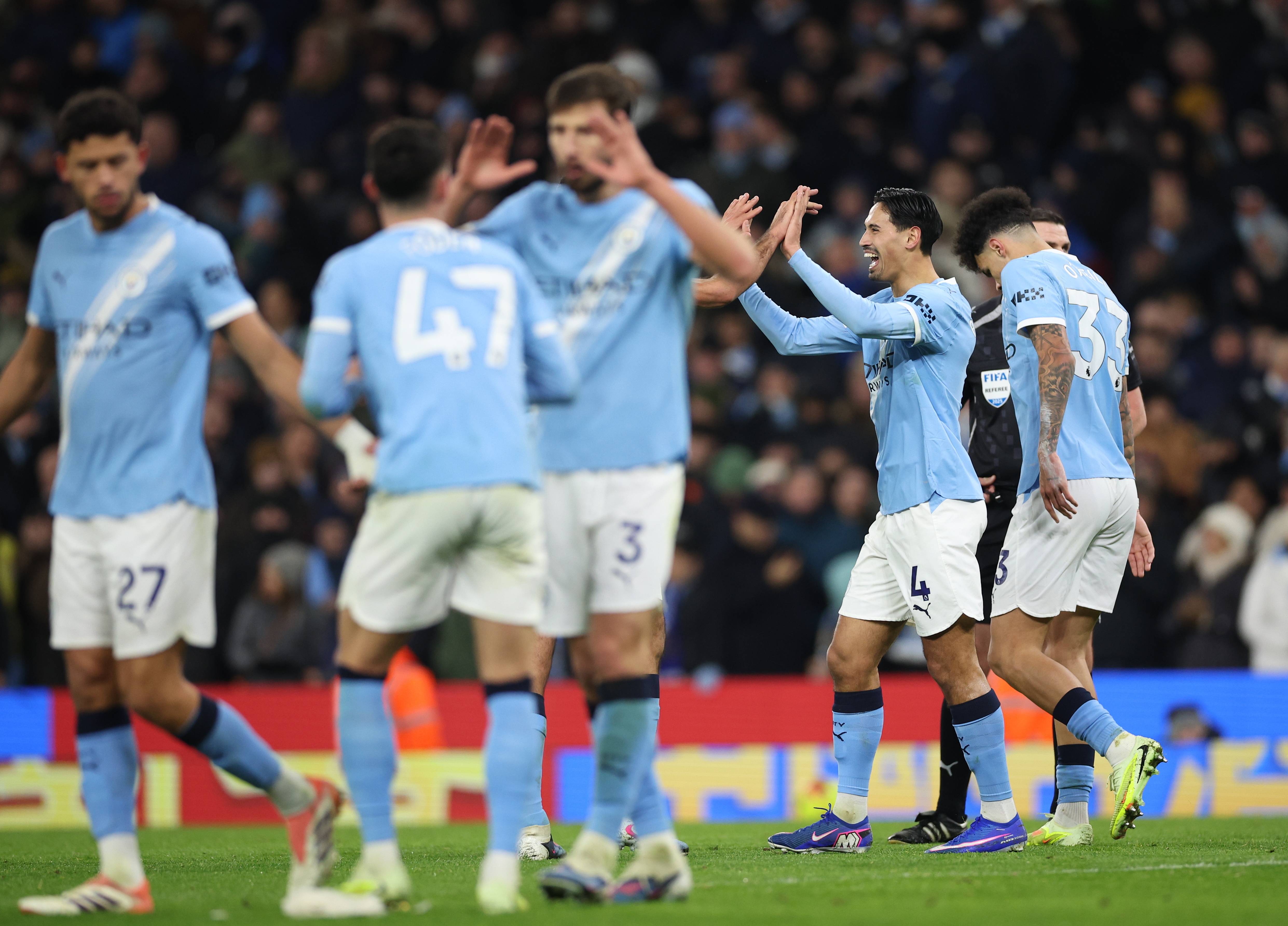 1月4日,曼彻斯特城队球员赖恩德斯(右二)与队友庆祝进球。 新华社/欧新