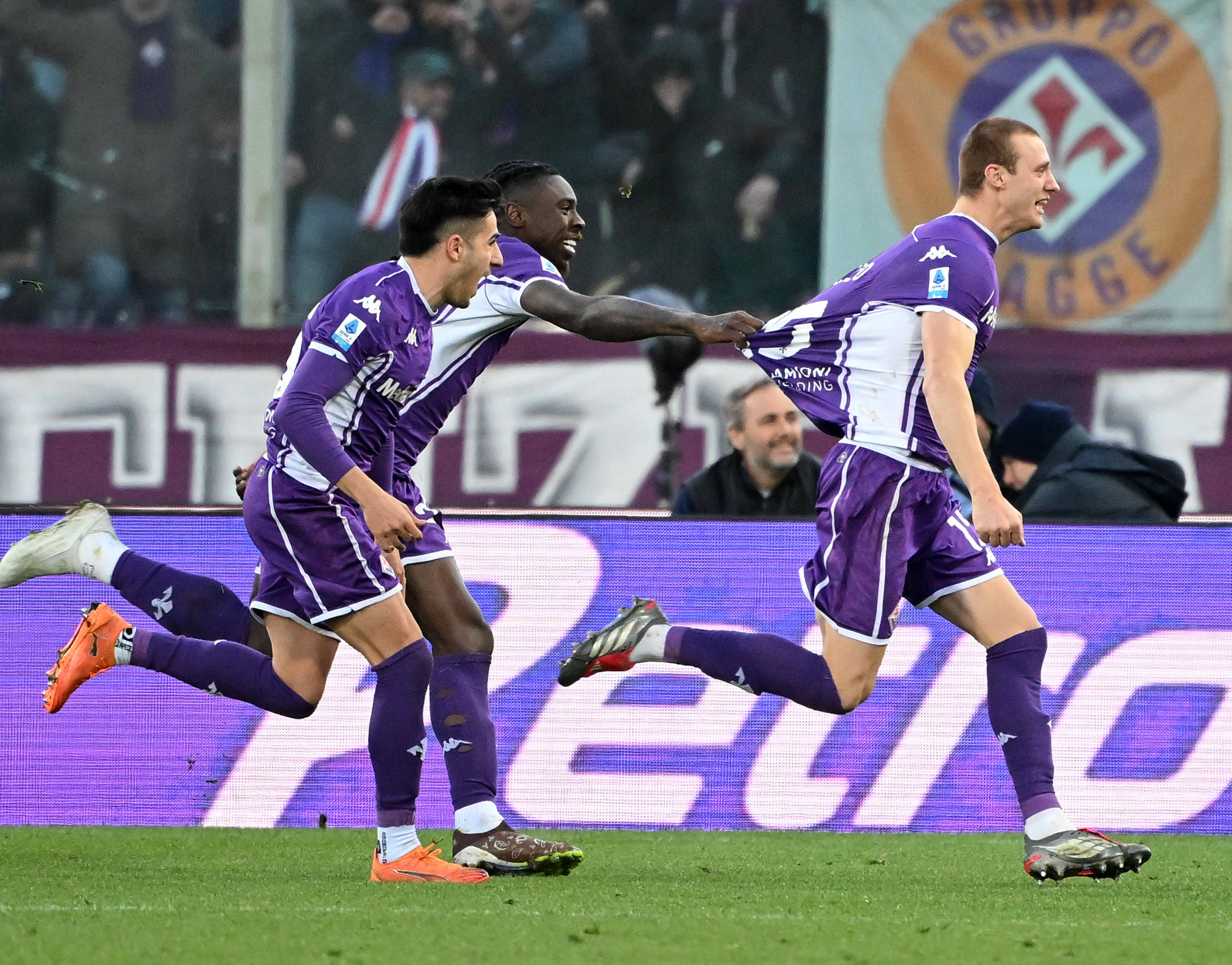 1月11日,佛罗伦萨队球员科穆佐(右)与队友庆祝进球。 新华社发(阿尔贝托·林格利亚摄)