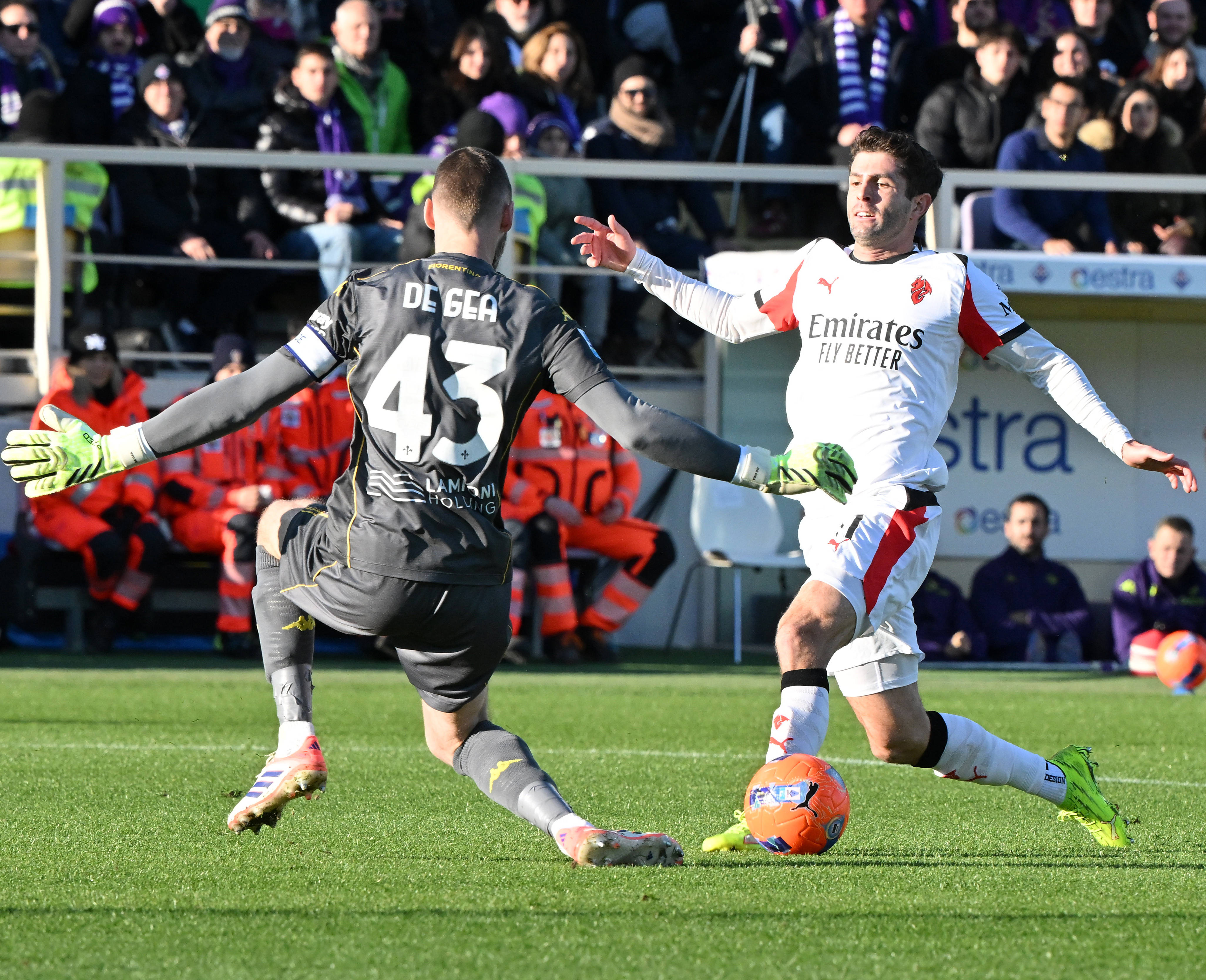 1月11日,AC米兰队球员普利希奇(右)与佛罗伦萨队守门员德赫亚在比赛中拼抢。 新华社发(阿尔贝托·林格利亚摄)