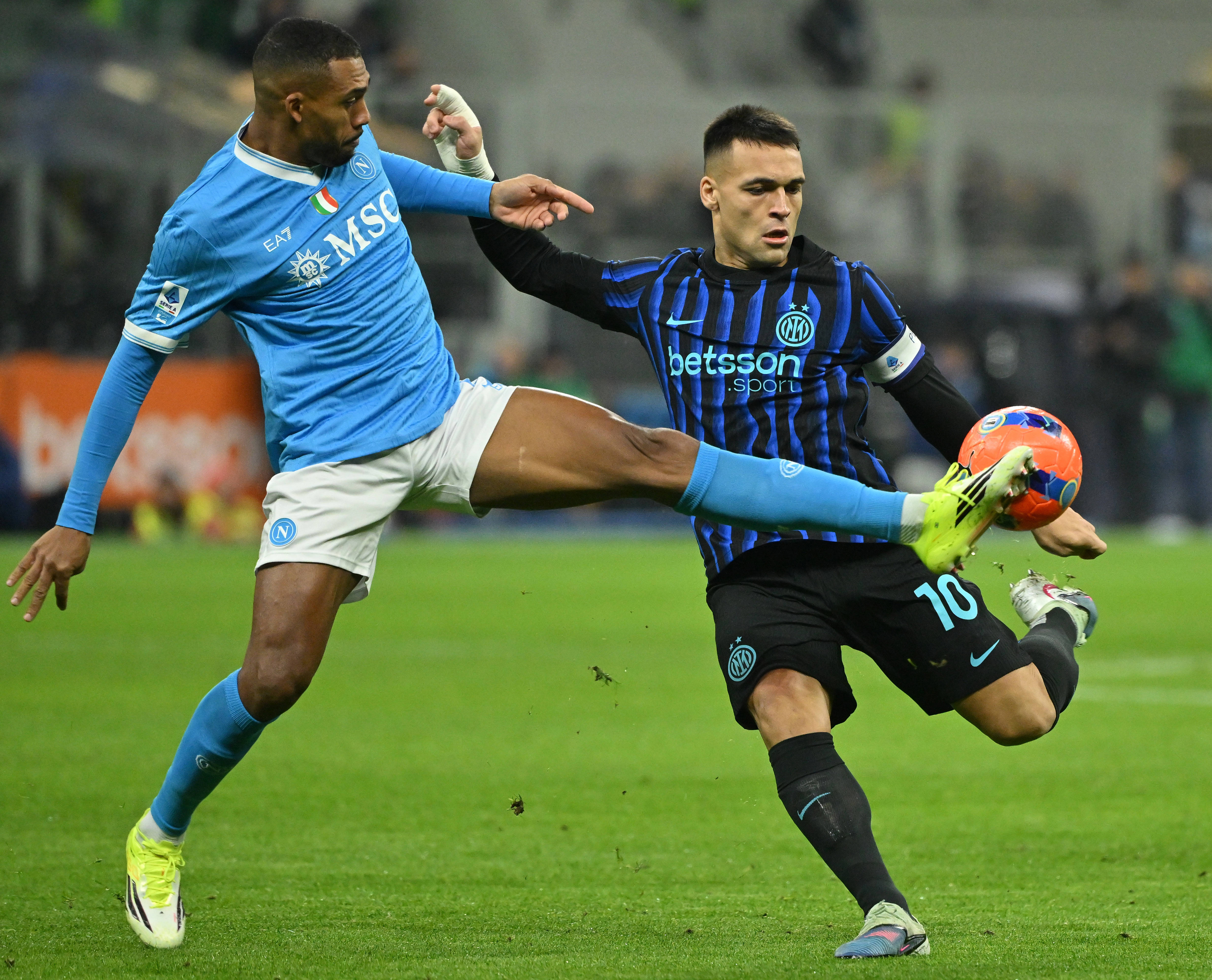 1月11日,国际米兰队球员劳塔罗·马丁内斯(右)与那不勒斯队球员拉赫玛尼在比赛中拼抢。 新华社发(阿尔贝托·林格利亚摄)